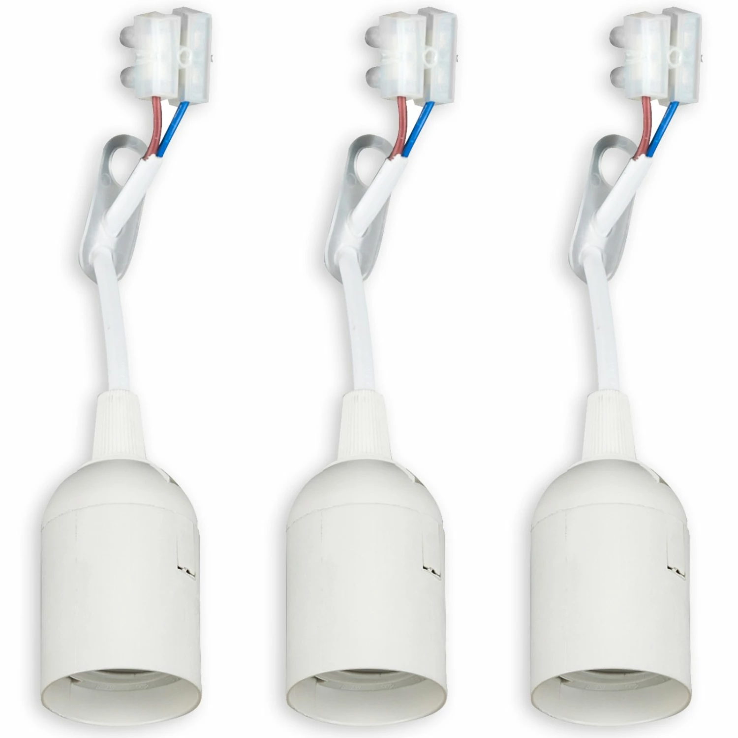 Praktisches 3er-Set Renovierungsfassungen in Weiß aus Kunststoff. Dieses 2-polige Schnurpendel mit Fassung E27 ist für bis zu 60 Watt ausgelegt und 23,8 cm lang.