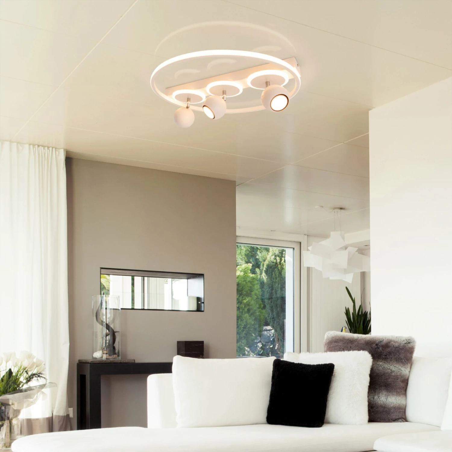 Die 3er-Spot LED Deckenleuchte Ronda ist nicht nur modisch, sondern sorgt mit warmweißen Licht auch für eine richtige Kuschelstimmung. Durch das Design in Kombination mit weiß, passt die Leuchte sehr gut in moderne Einrichtungen. Abgesehen von den Vorrichtungen innnerhalb der Spots, leuchten auch die Füße der Spots, als auch der Ring drum herum.