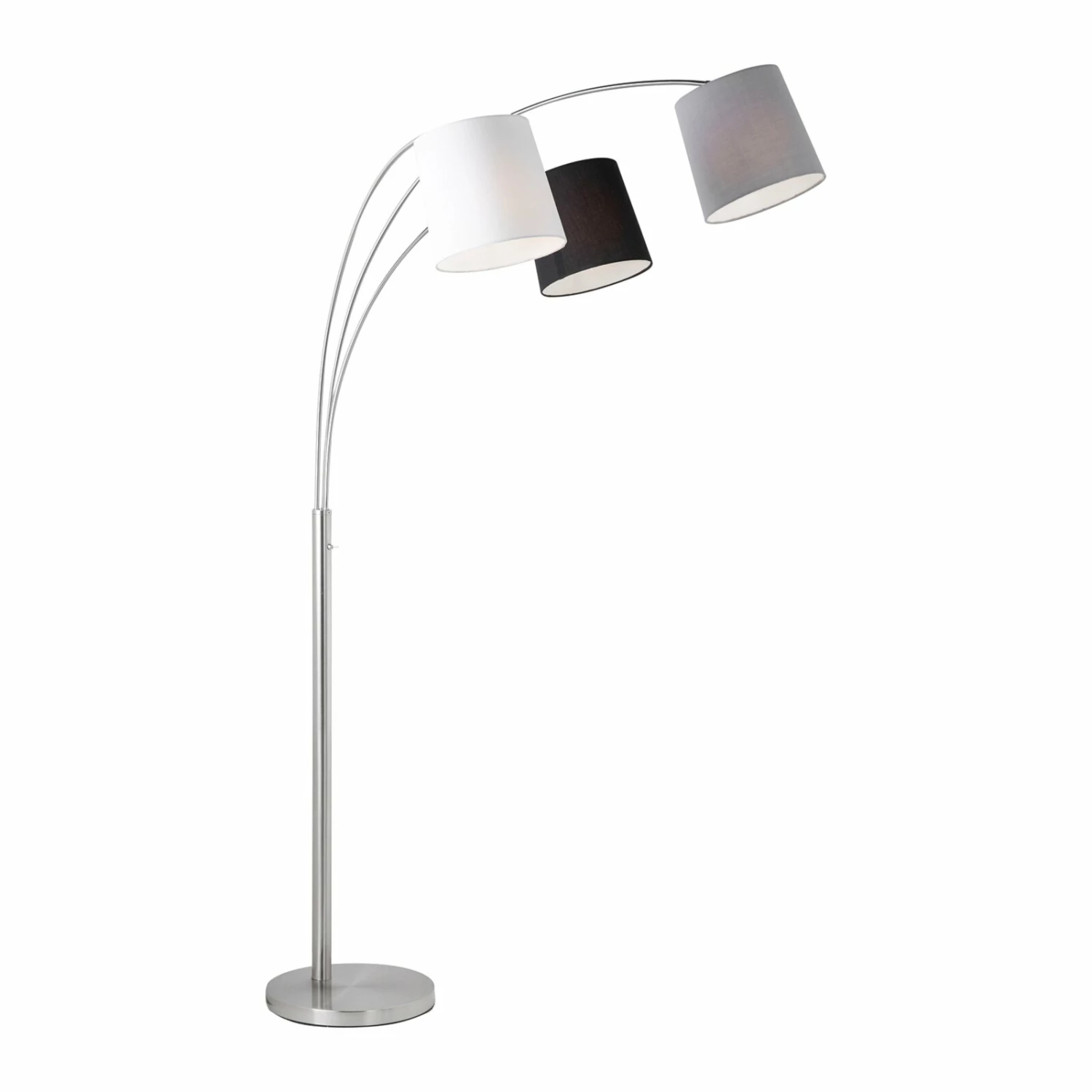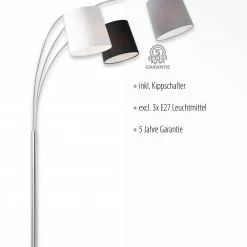 Diese angenehme Bogenleuchte spendet in Verbindung mit dem passenden Leuchtmittel eine angenehme Atmosphäre. Die 3-flammige Bogenleuchte umschließt das Leuchtmittel mit Stoffschirmen.