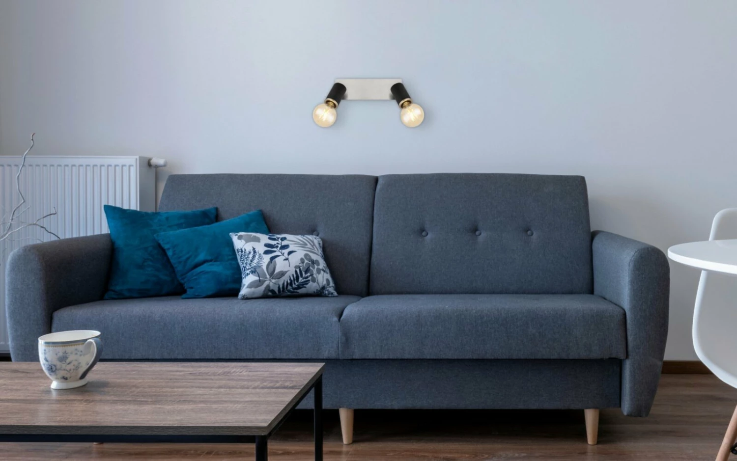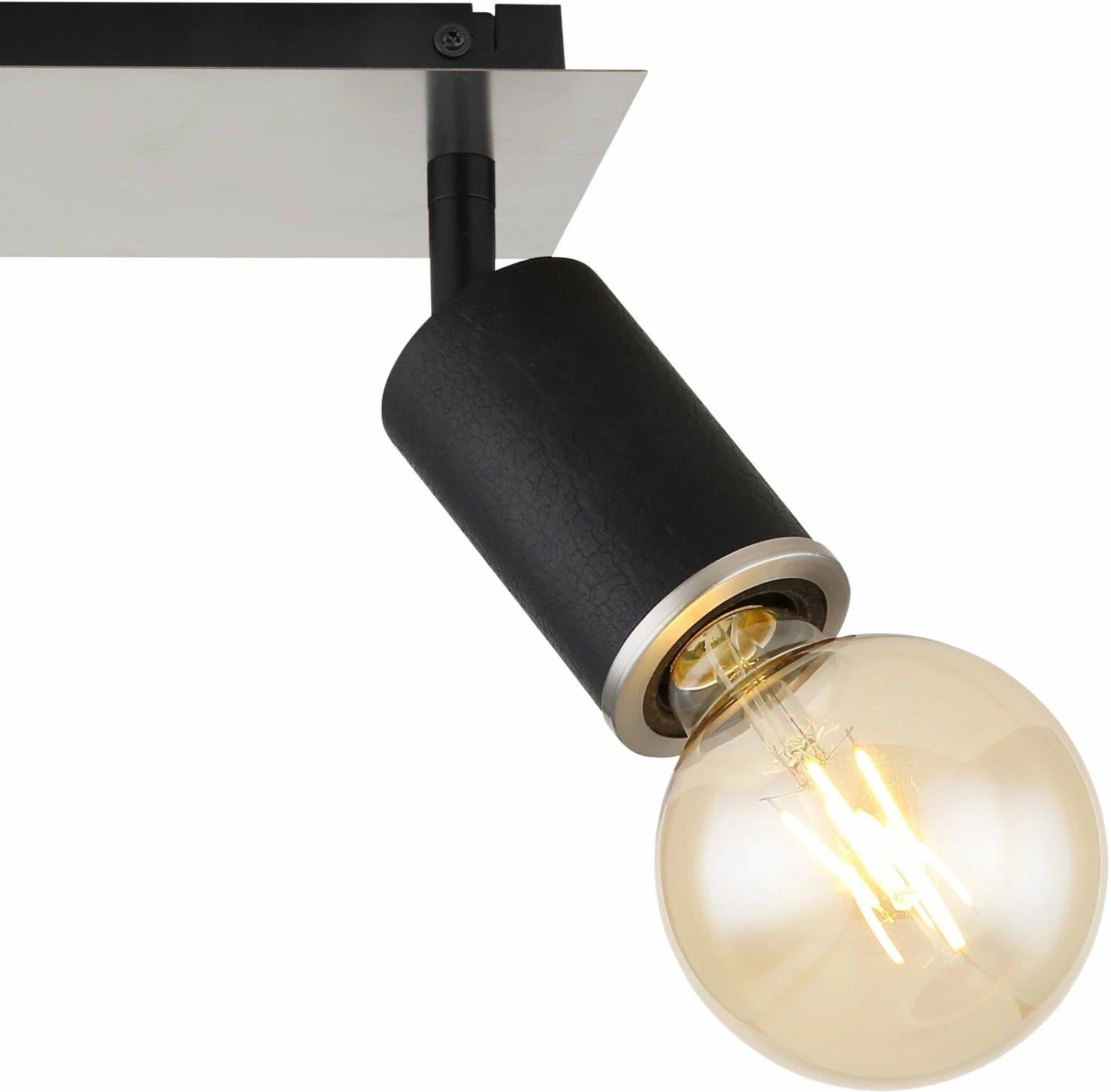 Der 2-flammige Deckenstrahler in Schwarz matt und Nickel matt ist ein echtes Prachtstück, denn das Holz ist mit einer verbrannten Optik versehen worden. Der Strahler ist etwa 31 cm breit, 18 cm hoch und 10 cm tief.