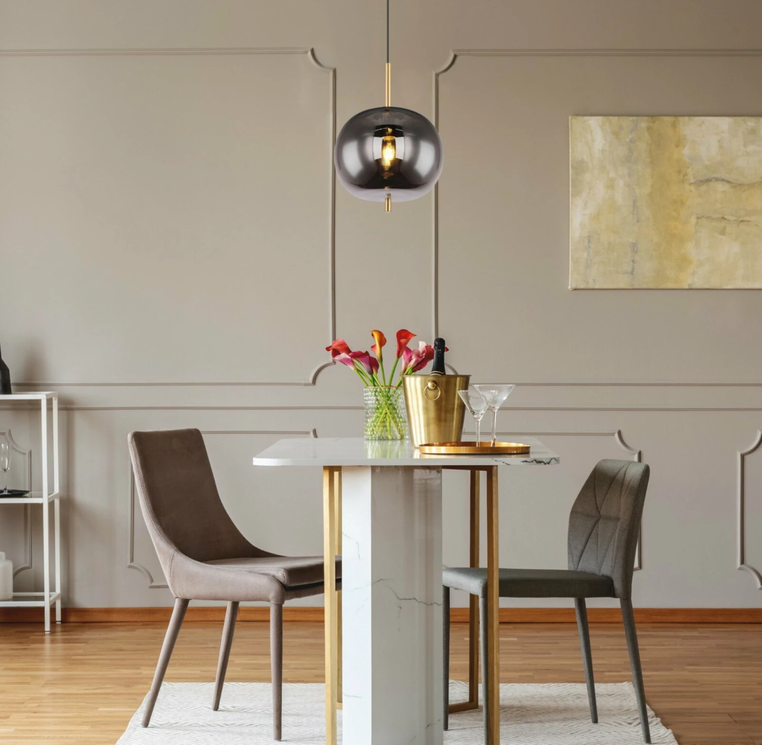 Diese HĂ€ngeleuchte eignet sich hervorragend, um deinem Esszimmer oder Wohnzimmer ein stilvolles Ambiente zu verpassen. Die LĂ€nge der Leuchte kann individuell angepasst werden. Die Farbkombination aus messingfarben und Grau lĂ€sst die Lampe besonders edel wirken.Â