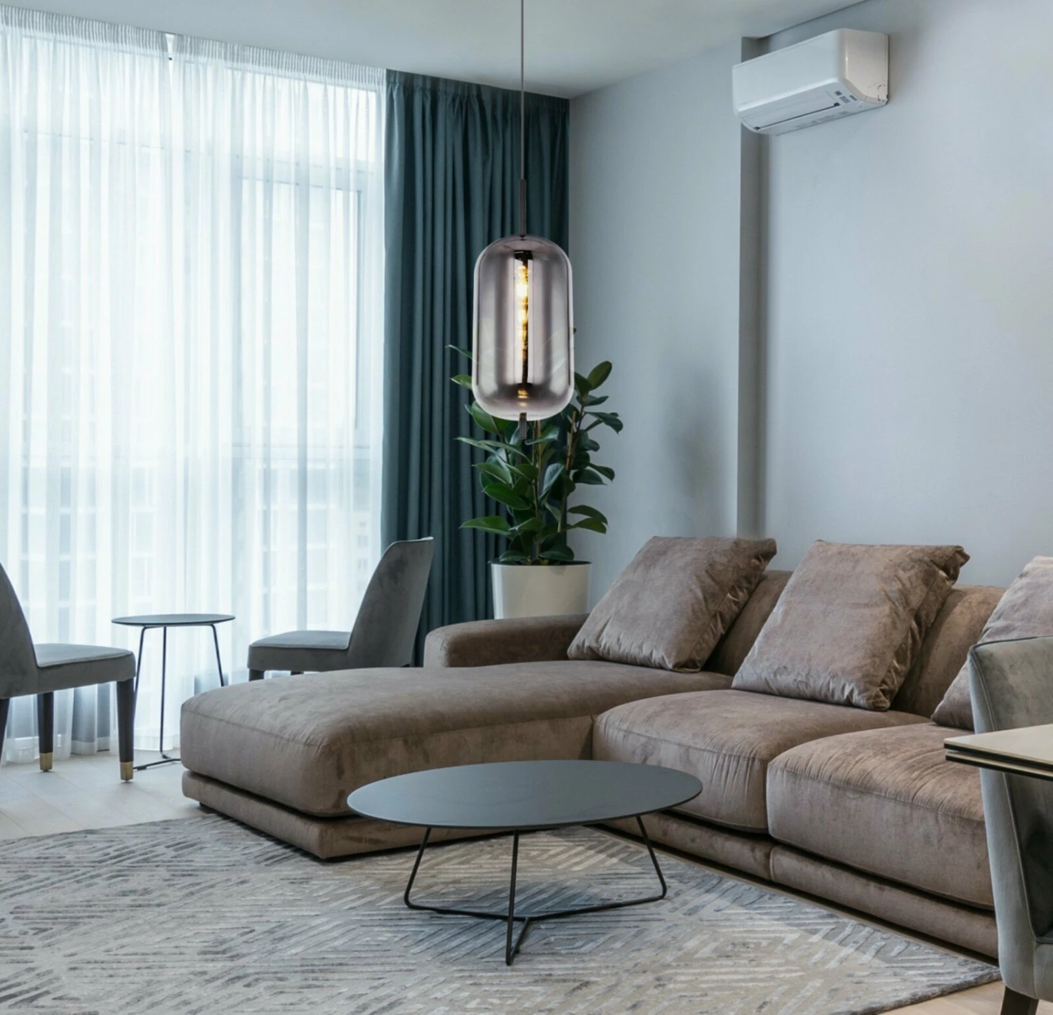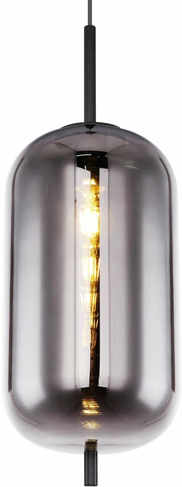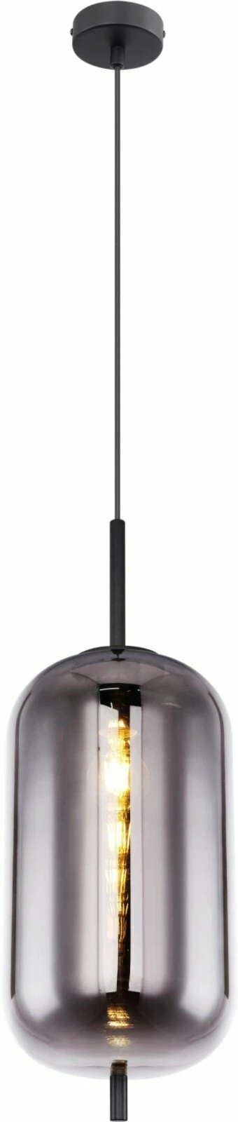 Die Hängeleuchte mit einem rauchfarbenen Glasschirm und schwarzen Metallelementen überzeugt durch ihr edles Design. Sie sorgt für ein tolles Ambiente im Ess- oder Wohnbereich und macht das Gesamtbild in deiner Wohnung komplett. Die E27-Fassung der Lampe kann mit einem Leuchtmittel deiner Wahl bestückt werden.Â