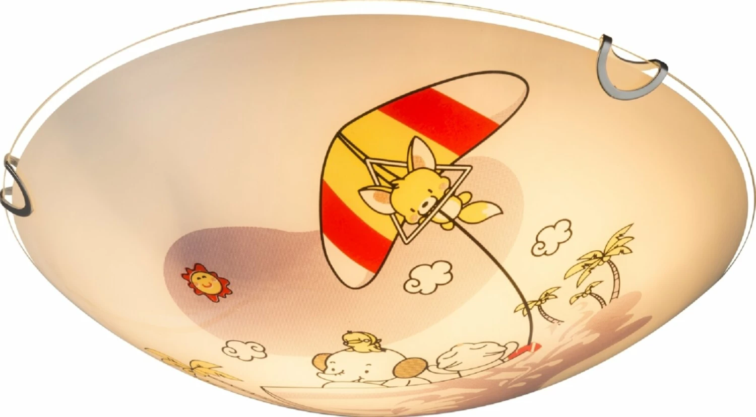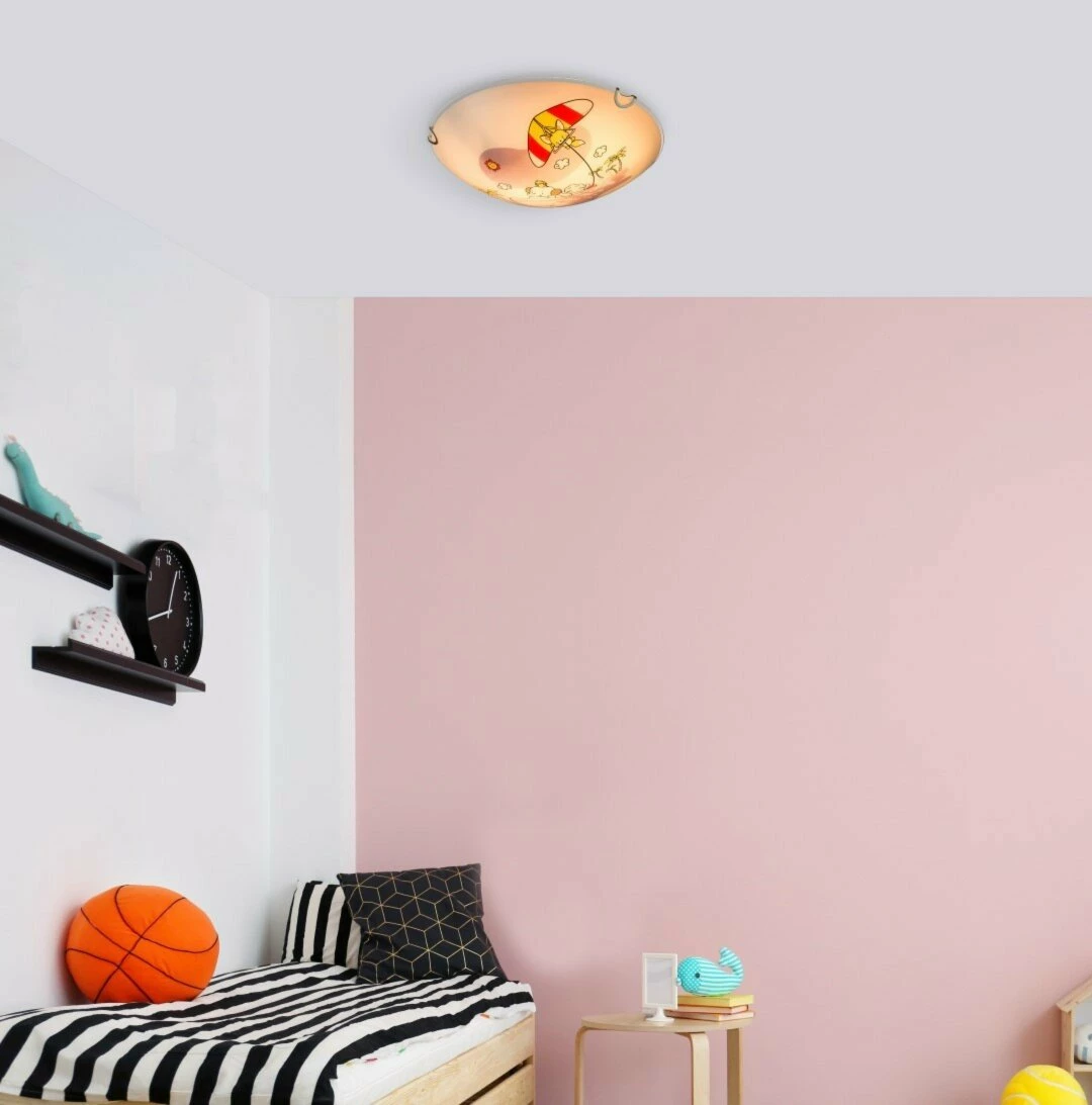 Diese runde Kinder-Deckenleuchte hat einen Durchmesser von etwa 30 Zentimetern und ist ein tierisches Highlight in jedem Kinderzimmer. Das süße Motiv mit bunten Tieren, die auf einem Boot durch das Meer segeln oder durch die Luft fliegen ist ein echt kreatives Highlight für deine Lieblinge. Das Glas der Kinderlampe bietet im Inneren Platz für zwei E27-Leuchtmittel.