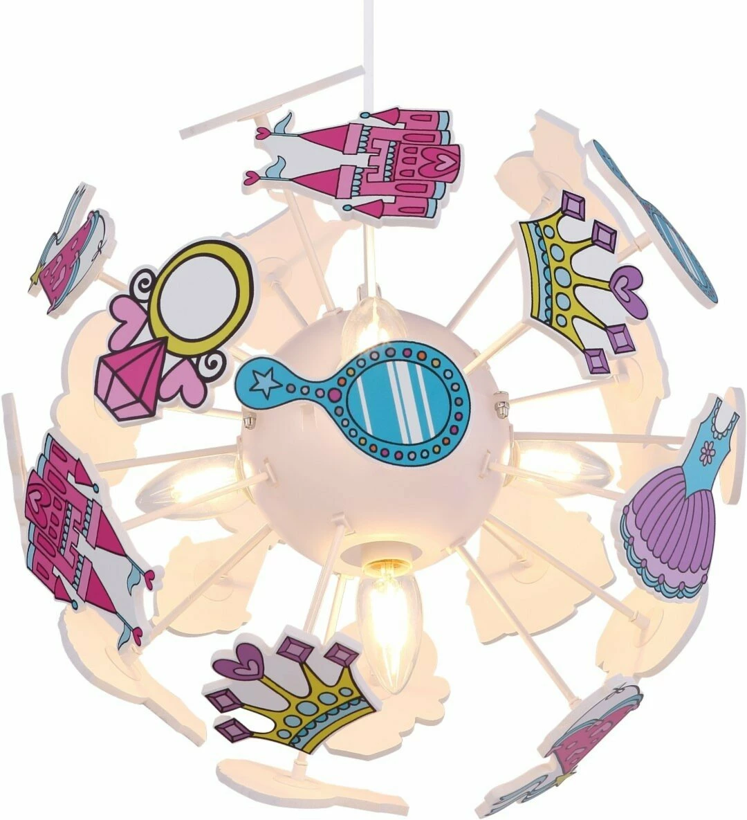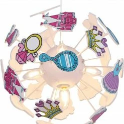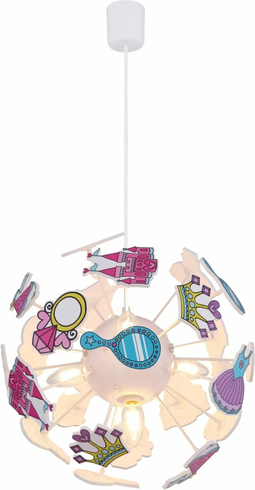 Diese Kinder-Pendelleuchte wird deinem Kind garantiert gefallen, denn das Design, welches aus einer Kugel mit Kronen, Kleidern, Spiegel und Schlössern besteht, zaubert deinem Kind ein Lächeln ins Gesicht und sorgt für eine bewundernswerte Atmosphäre.