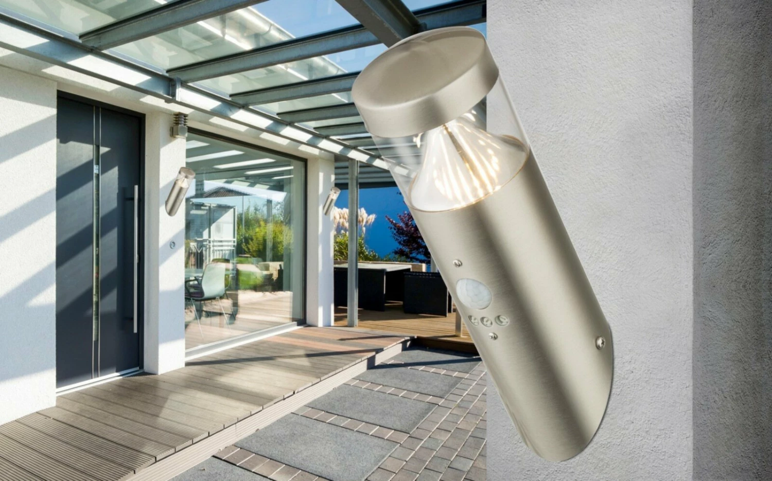 Diese Außenleuchte mit eingebautem Bewegungsmelder eignet sich hervorragend für die Terasse oder den Balkon. So kannst du auch bei Dunkelheit den Abend im Freien genießen.