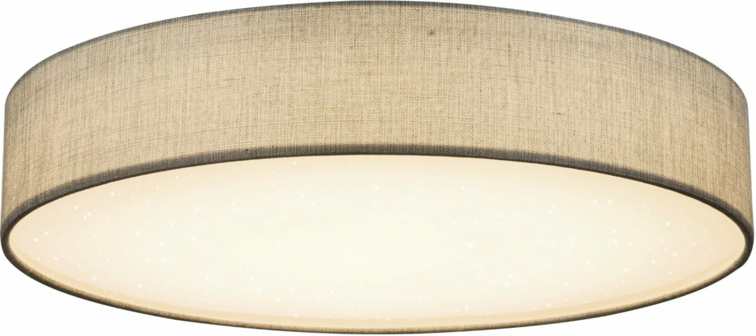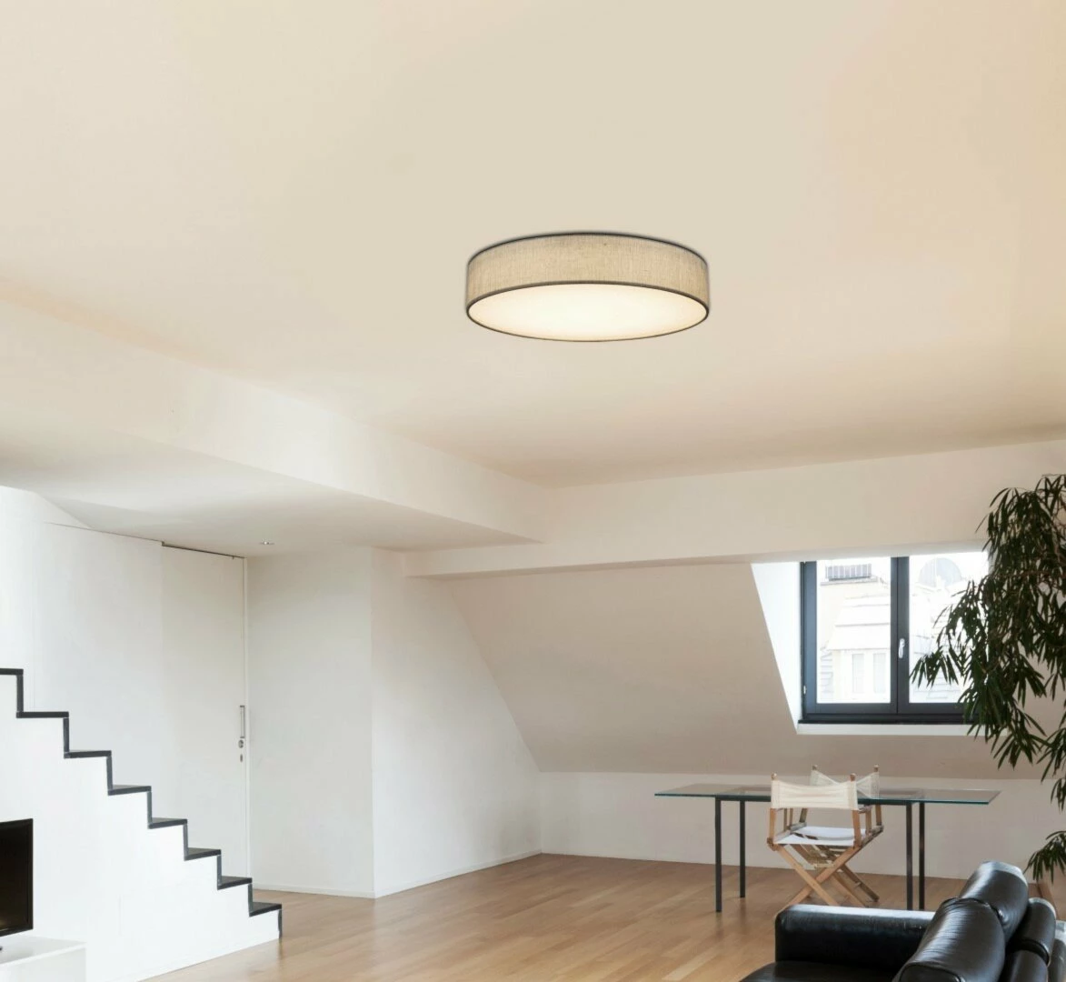 Diese besonders schöne Deckenleuchte punktet durch Design und Funktionalität. Der etwa 14 Zentimeter hohe und runde Textilschirm in einem schlichten Grau leistet mit dem 80 Watt LED helle 4000 Lumen. Mithilfe der Fernbedienung kann die Lichtfarbe je nach Bedarf in verschiedensten Stufen umgeschaltet werden.