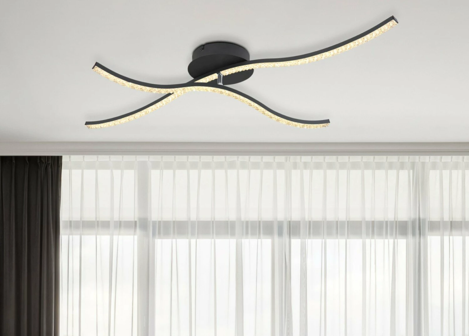 Ein echter Hingucker ist diese Deckenleuchte in der Farbe Schwarz. Sie ist mit Acrylkristallen ausgeschmückt und der dünnere Arm lässt sich drehen. Eine unendliche Kombinationsmöglichkeit für viele Inneneinrichtungen.