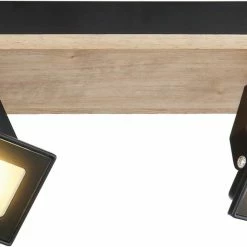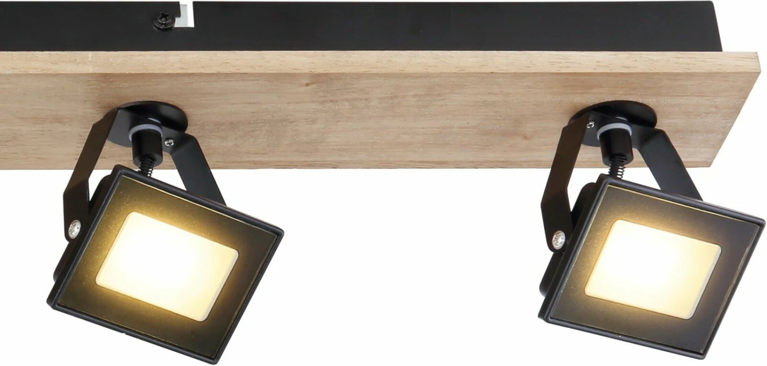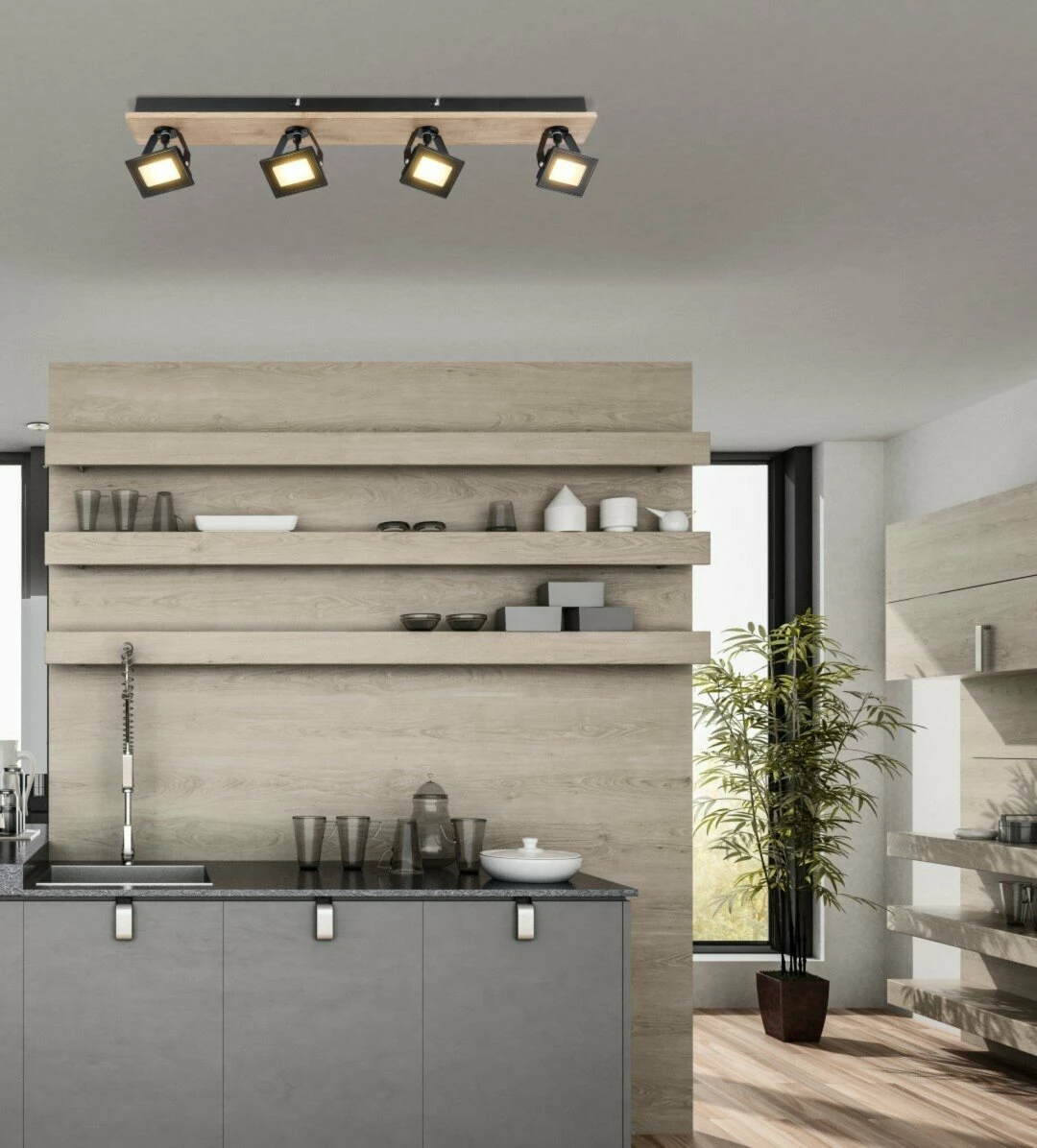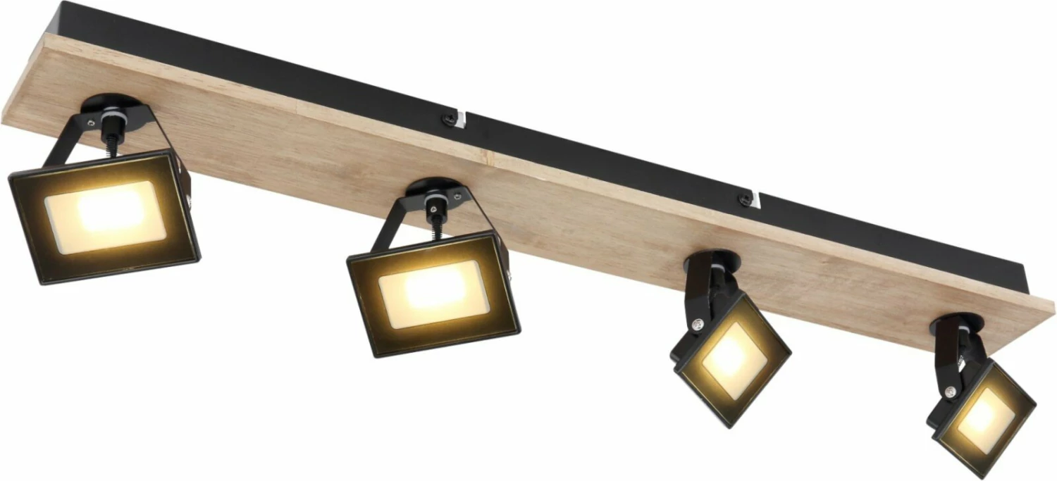 Diese praktische LED-Deckenleuchte überzeugt durch ihr schlichtes Design aus Holz und schwarzem Metall. Außerdem besitzt sie vier schwenkbare Strahler die mit satiniertem Glas versehen und durch befestigte Bügel auf der Holzplatte montiert sind. Die LED-Strahler leuchten ebenfalls eine angenehme, warmweiße Farbtemperatur von 3000 Kelvin aus und haben eine Lebensdauer von etwa 20000 Stunden.
