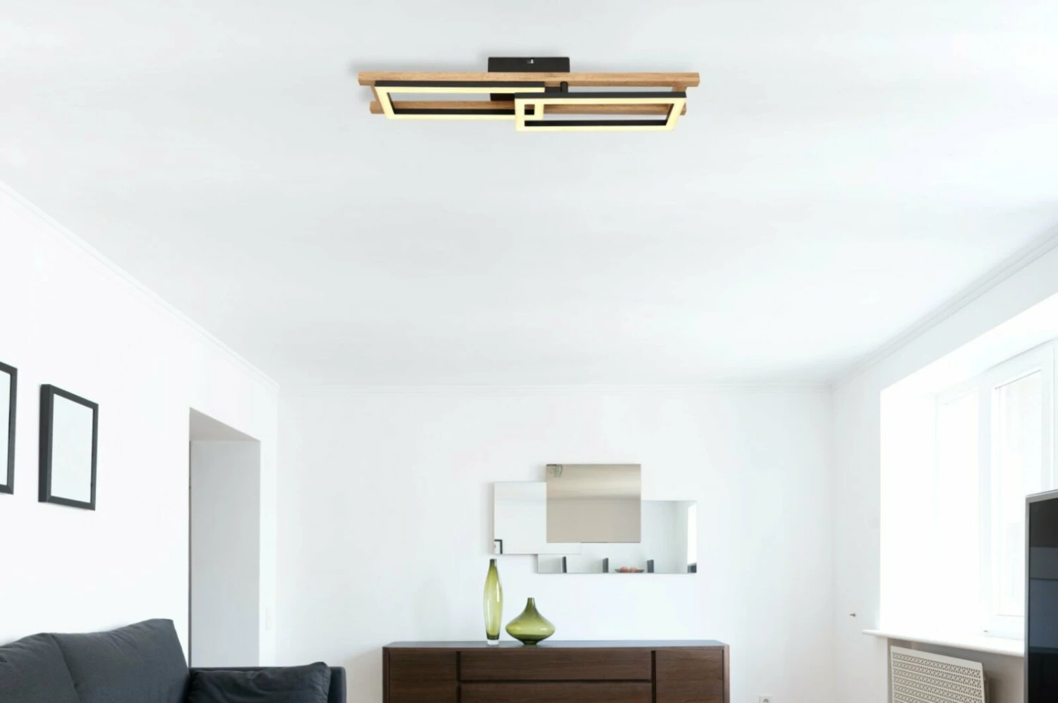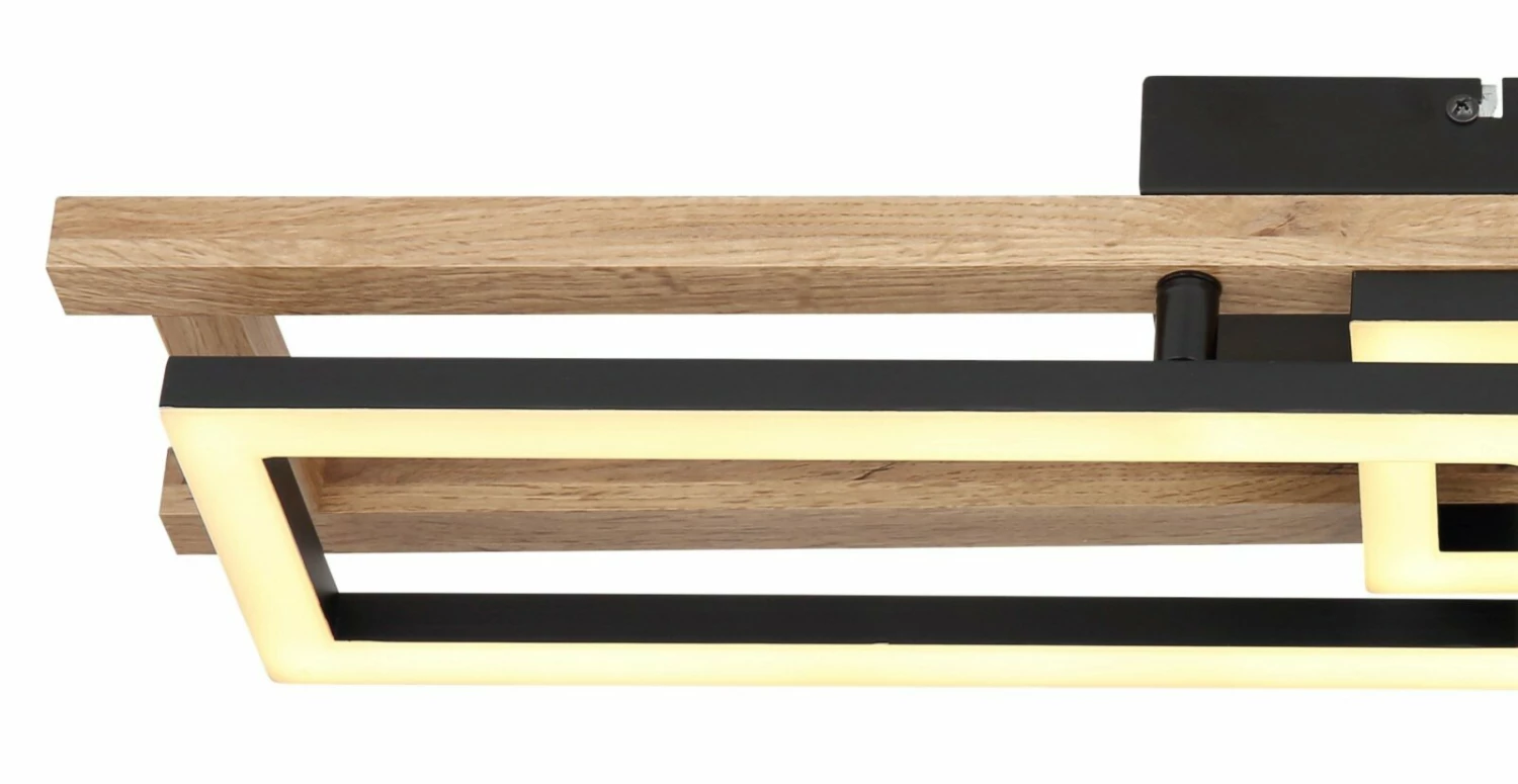 Die LED-Deckenleuchte ist durch den schönen Holzbalken und den rechteckigen LED-Boards in Schwarz ein echter Blickfang. Sie spendet Licht in einem wohnlichen Warmweiß. Außerdem ist ein Rechteck drehbar, damit du die Lichtverhältnisse an deine Bedürfnisse anpassen kannst.