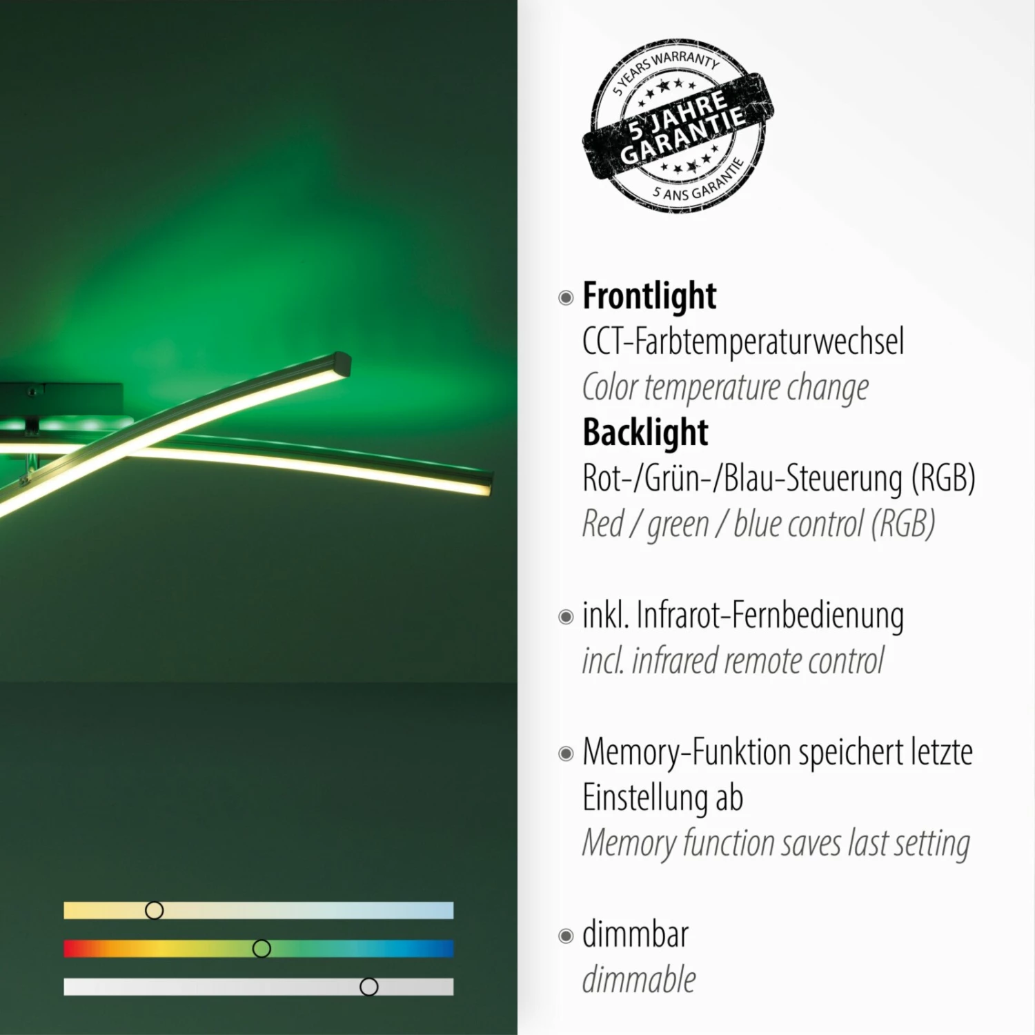 Das ästhetische Design dieser LED-Deckenleuchte gibt Ihrem Wohnraum ein modernes Element. Dabei wird das stilvolle Design besonders durch die Farbwechselfunktionen hervorgehoben. Denn die Lichtfarbe des Hintergrundlichtes, wie auch des Hauptlichts sind variabel einstellbar. So kann das Hintergrundlicht mittels der RGB-Farbwechselfunktion in bunten Farben erstrahlen. Bei dem Frontlicht ist die Farbtemperatur von warm- bis neutralweiß einstellbar. Beide Funktionen können mit der mitgelieferten Fernbedienung gesteuert werden.