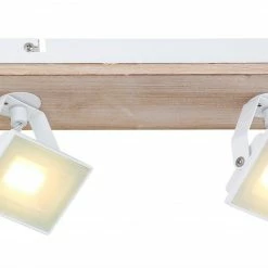 Diese praktische LED-Deckenleuchte überzeugt durch ihr schlichtes Design aus Holz und weißem Metall. Außerdem besitzt sie vier schwenkbare Strahler die mit satiniertem Glas versehen und durch befestigte Bügel auf der Holzplatte montiert sind. Die LED-Strahler leuchten ebenfalls eine angenehme, warmweiße Farbtemperatur von 3000 Kelvin aus und haben eine Lebensdauer von etwa 20000 Stunden.
