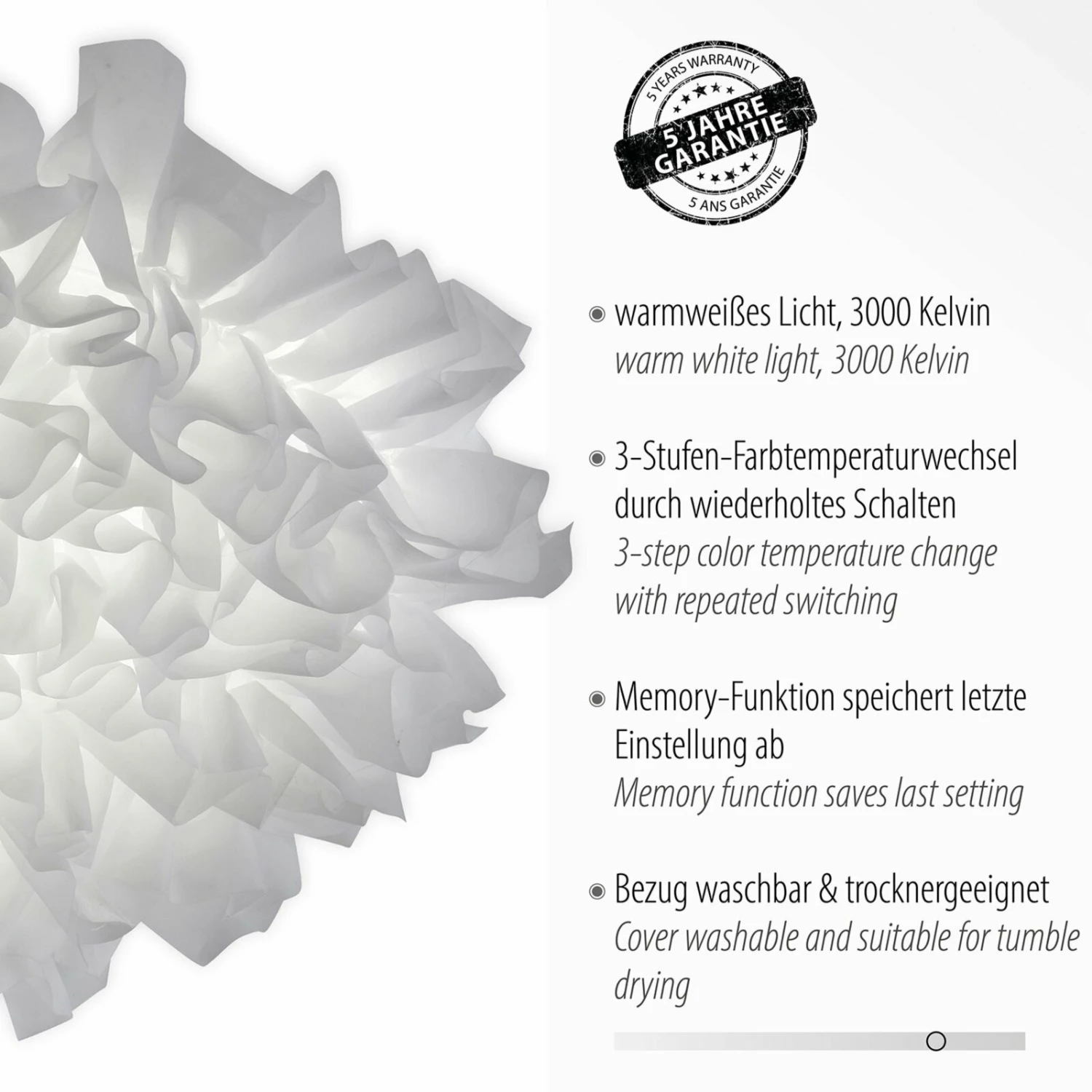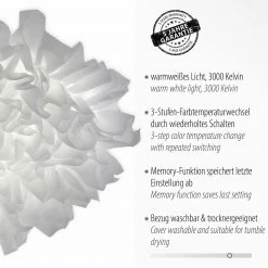Diese LED-Deckenleuchte mit gefälligem Design überzeugt sofort! Die Dimmbarkeit ist in drei Stufen gegeben, zusätzlich verfügt diese Deckenleuchte über eine Memoryfunktion. Der Bezug ist außerdem waschbar und trocknergeeignet.