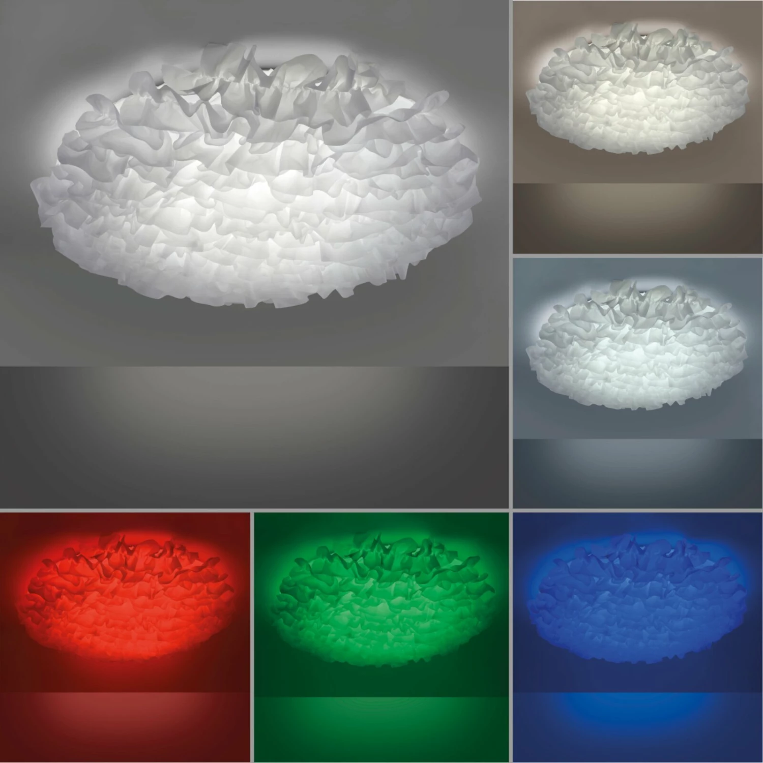 Die Deckenleuchte sorgt für eine außergewöhnliche Beleuchtung, da Überlappungen des Stoffes dafür sorgen, dass das gesamte Leuchtbild unterschiedlich ist. Die Deckenleuchte ist durch ihr wolkenartiges Design ideal dafür geeignet, dem Raum eine himmlische Atmosphäre zu verleihen. Zudem ist die Leuchte durch die SmartHome Integration
