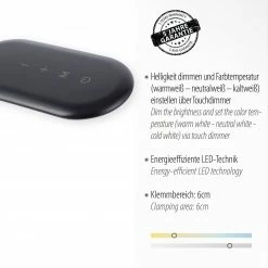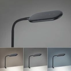 Diese LED-Klemmleuchte in Schwarz eignet sich perfekt, wenn Sie nur ein geringes Platzangebot auf Ihrem Schreibtisch haben. Sie lässt sich ganz einfach am Rand der Schreibtischplatte montieren. Zudem ist sie mit einem flexiblen Arm ausgestattet, damit Sie die Lampe perfekt ausrichten können. Die verschiedenen Farbtemperaturen lassen sich über die Tochfunktion auf der Oberseite einstellen.