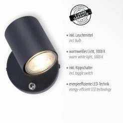 Die LED-Wandleuchte ist aus anthrazitfarbenem Metall gefertigt und sorgt mit seiner einfachen Handhabung für eine zuverlässige Ausleuchtung Ihres Raumes.