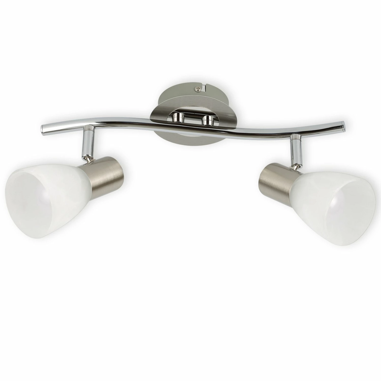 Dieser LED-Spotbalken ist mit 2 Flammen ausgestattet. Die Schirme sind weiß marmoriert und die Halterung aus Metall in mattem Nickel gehalten. Die geschwungene Form ist besonders modern und wirkt auch ausgeschaltet besonders schick.