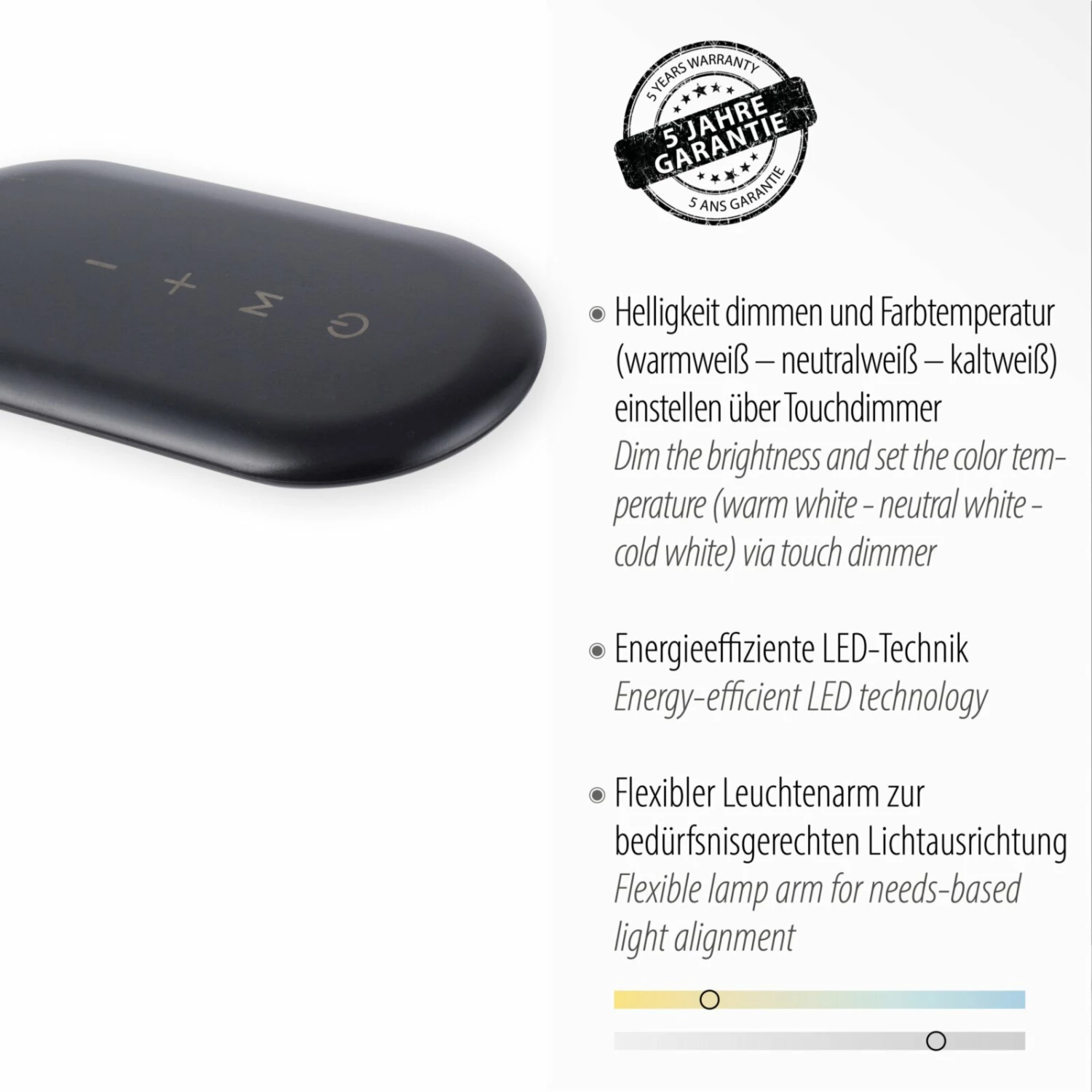 - Farbtemperatur und Helligkeit einstellbar