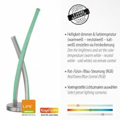 Mit dieser schön geschwungenen LED-Tischleuchte erhellen Sie Ihren Raum in bester Weise! Dank Smart Home können Sie diese Lampe über Ihr Smartphone steuern und so die Farbe oder auch die Farbtemperatur perfekt anpassen. Diese Anpassungen können auch mit der mitgelieferten Fernbedienung vorgenommen werden.