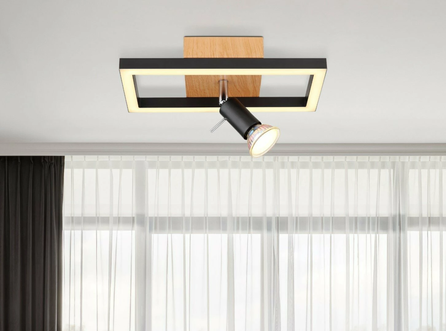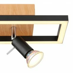 Diese LED-Wandleuchte überzeugt durch ihr Design in Schwarz Matt und Holzoptik und besitzt gleich zwei verschiedene Lichtquellen. Sie ist mit einem warmweißen LED-Board ausgestattet. Das GU10 Leuchmittel für den Spot ist nicht im Lieferumfang enthalten