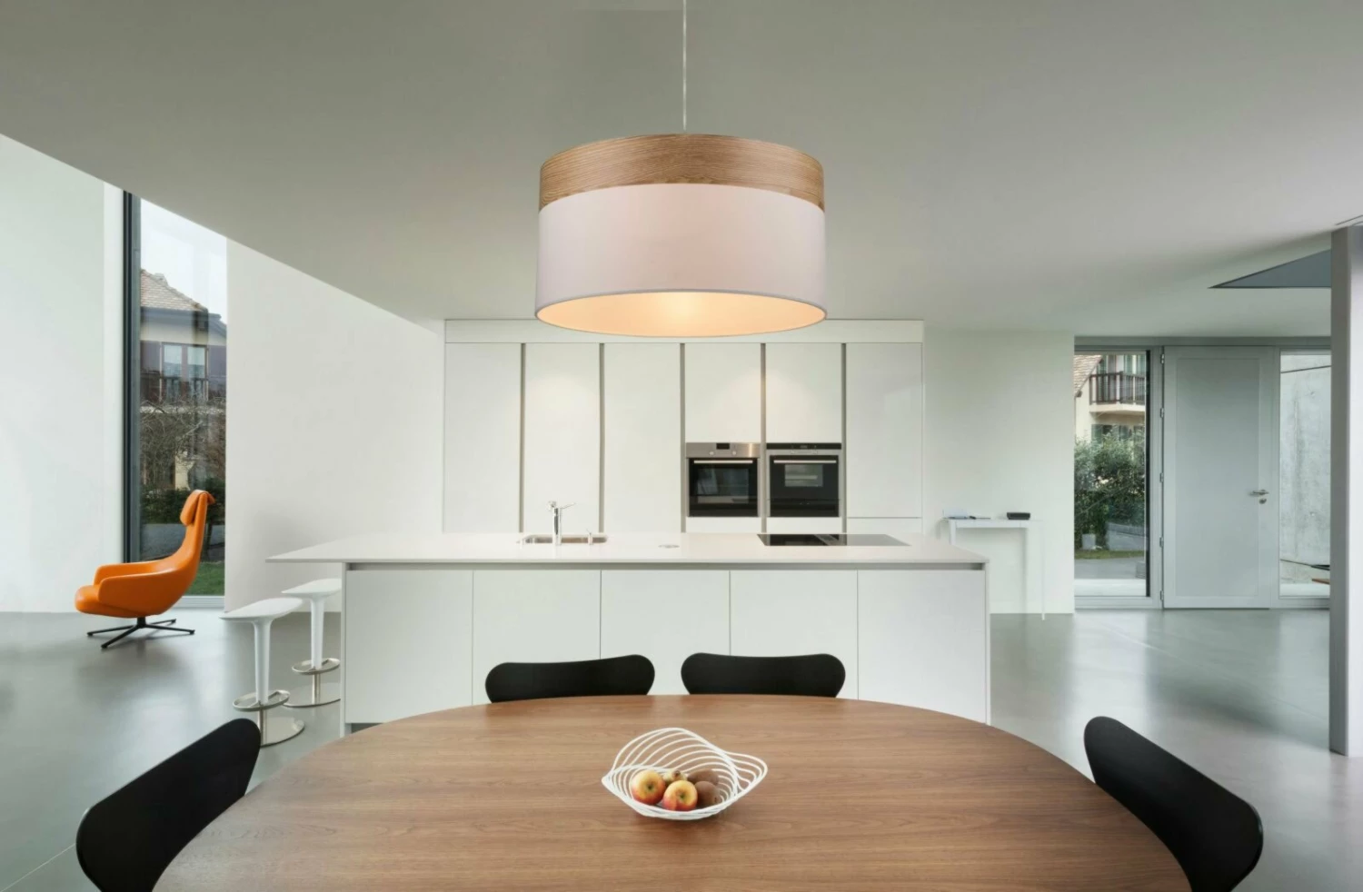 Sorgen Sie in Ihrem Wohnraum fĂŒr reichlich Licht mit Hilfe von dieser tollen Pendelleuchte. Der Materialmix aus Metall, Holz und Stoff macht diese Lichtquelle zum absoluten Hingucker.