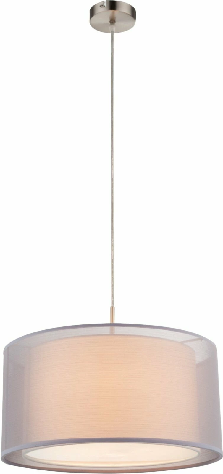 Diese edle Pendelleuchte mit einem Gestell in einem matten Nickel besitzt gewissermaßen zwei Lampenschirme, wodurch eine besondere Optik entsteht. Der innere Schirm aus Acryl und der äußere Schirm in einem durchscheinenden Grau sehen in Kombination besonders hochwertig aus.