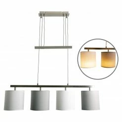 Die vierflammige Pendelleuchte in Grau und Weiß überzeugt besonders durch ihr modernes Design. Die verschiedenfarbigen Schirme machen die Leuchte zu einem tollen Hingucker. Jeder Schirm hat einen Durchmesser von etwa 13 cm und beinhaltet jeweils im Inneren eine Fassung für ein E27-Leuchtmittel.