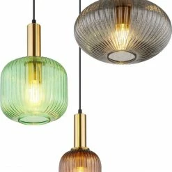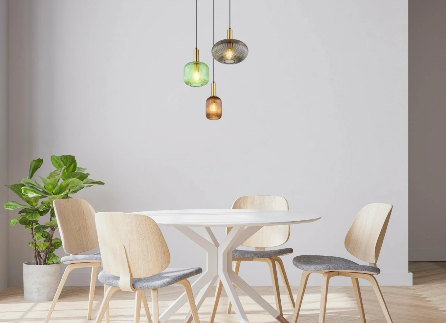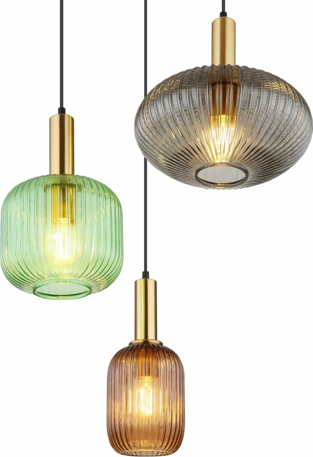 Die Pendelleuchte ist ein echtes Prachtstück, denn neben den drei verschiedenen Gläsern, die gerillt sind, liefert sie wegen der harmonierenden Farbkombination ein modernen Flair.