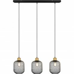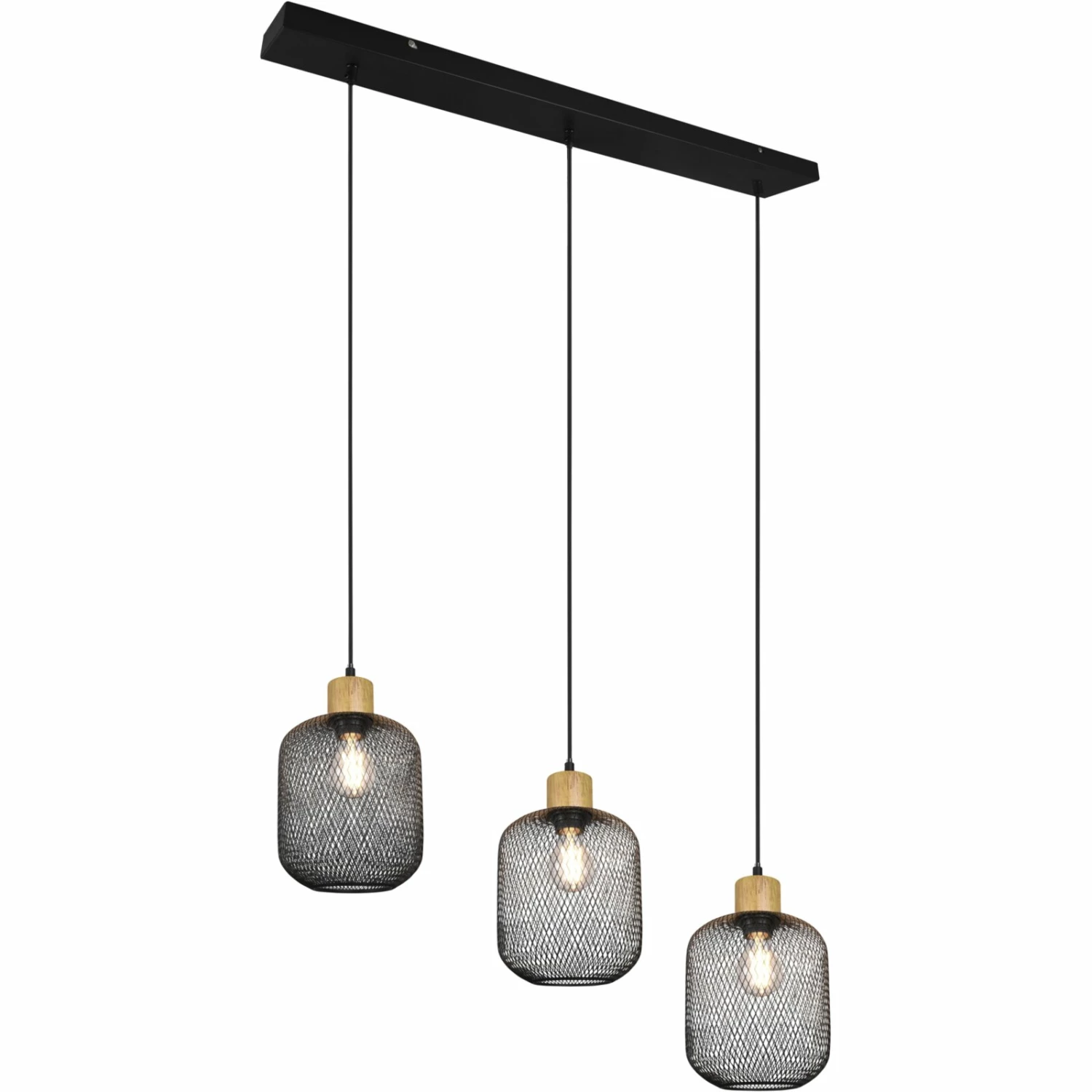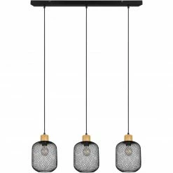 Zum angesagten Industriestil passt die 3-flammige Pendelleuchte im Materialmix. Sie bietet Ihnen ein trendiges Design für Ihren Esstisch und sorgt für einen Blickfang. Dies bewirken die ovalen Lampenschirme aus robustem Metalldraht in Farbe Schwarz. Kombiniert sind sie mit Anschlüssen aus naturfarbenem Holz. Dadurch entsteht eine attraktive Farbkombination, die mit vielen Einrichtungen harmoniert. Ein weiterer Pluspunkt sind die unempfindlichen Oberflächen. Die Montage der Innenleuchte erfolgt über das Deckenpaneel. Für den Betrieb benötigen Sie drei Leuchtmittel der Fassungsgröße E27 zu je maximal 40 Watt.