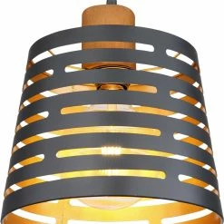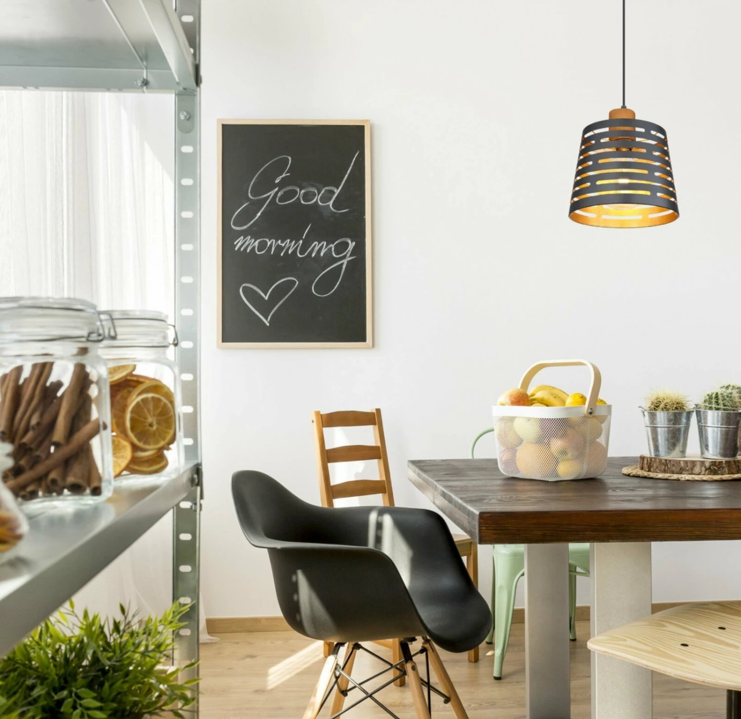 Diese Pendelleuchte sorgt für ein modernes Ambiente, vorallem wegen des Schirms. Die Leuchte ist 25 cm breit, 120 cm hoch und 25 cm tief.