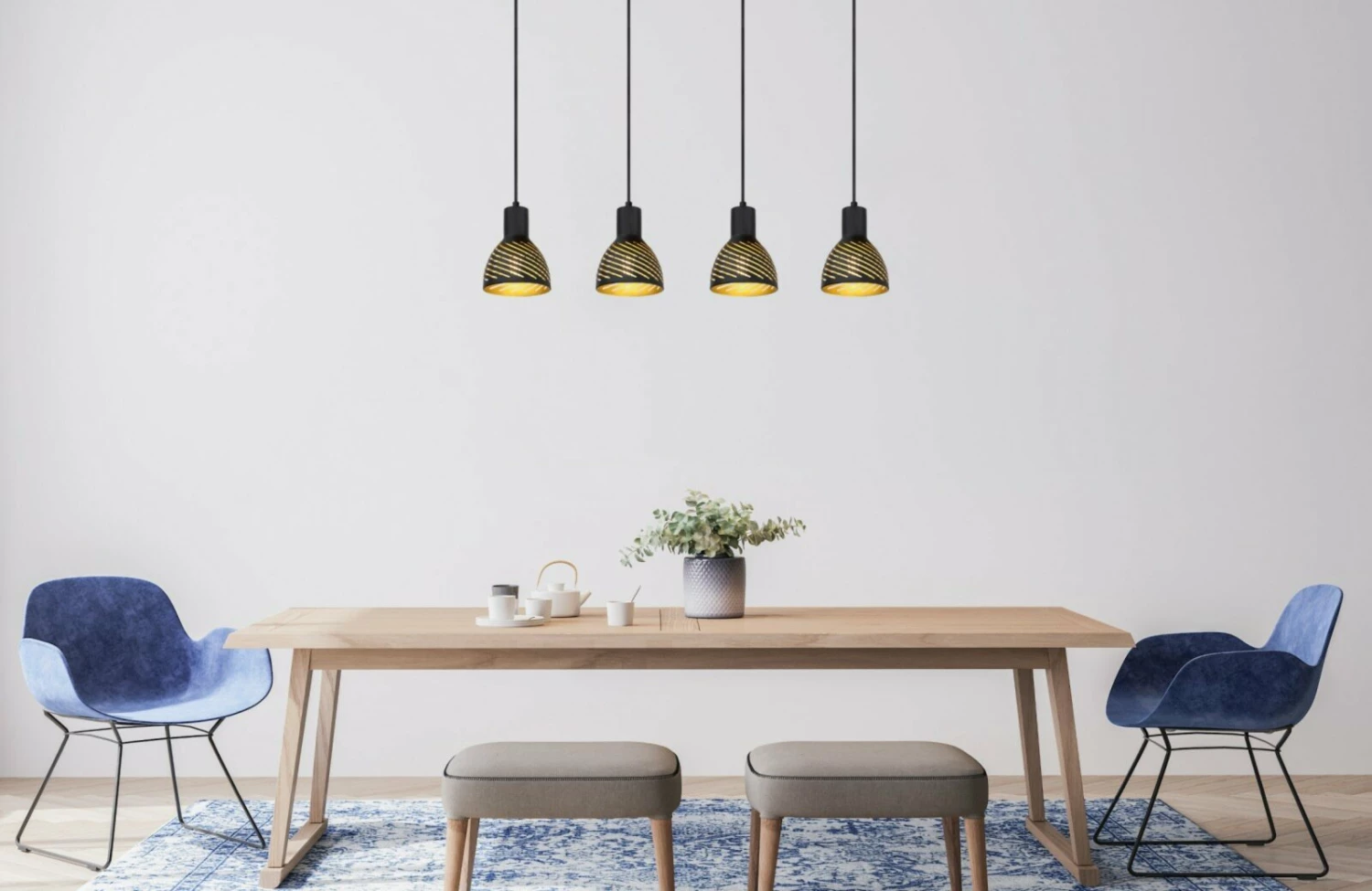 Diese Pendelleuchte ist auf den ersten Blick eine schlichte Lampe die mit einer Holzoptik versehen wurde, allerdings ist das Innere des Schirms in Goldfarben designt worden, sodass diese Lampe ein echter Hingucker ist