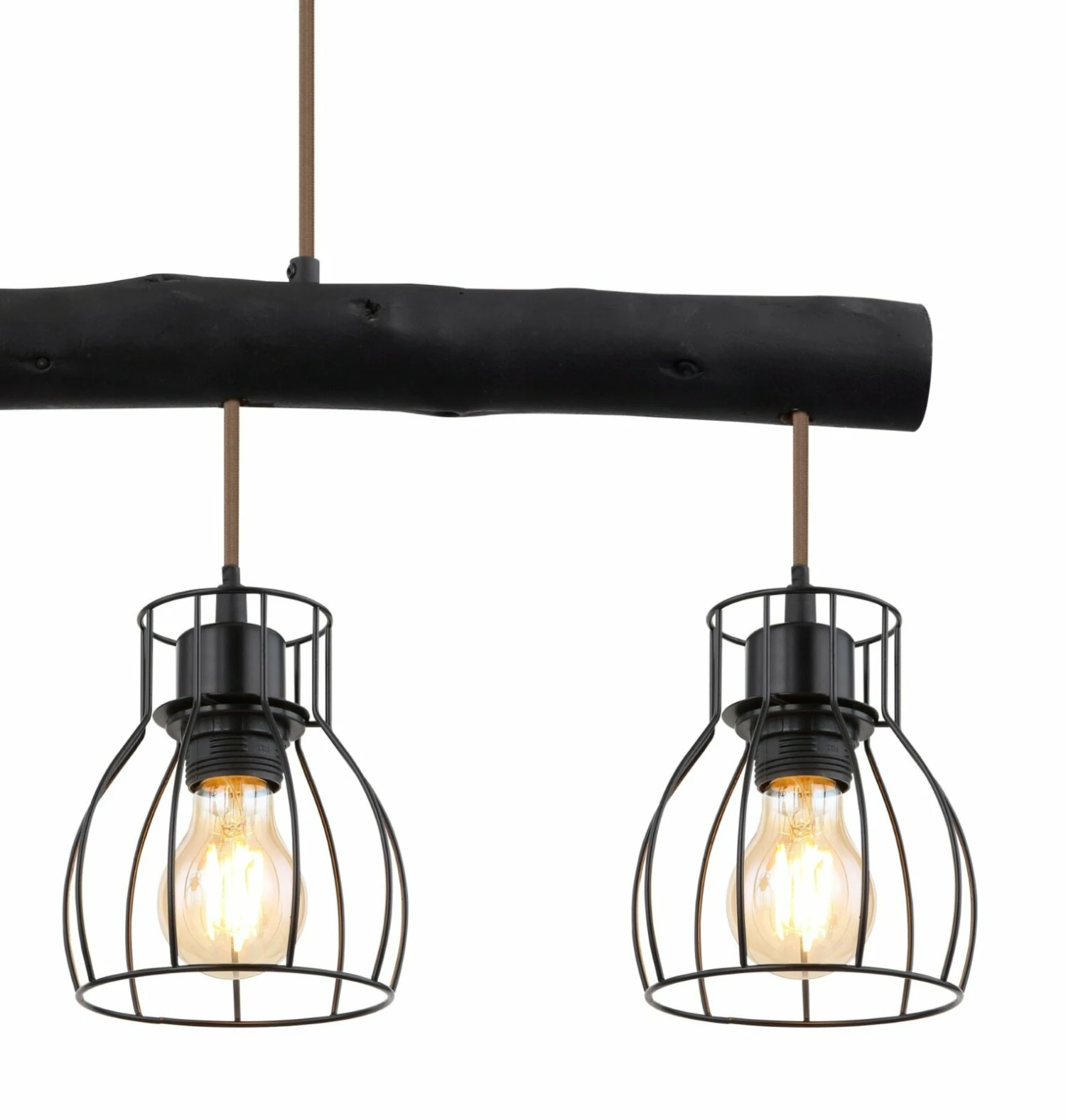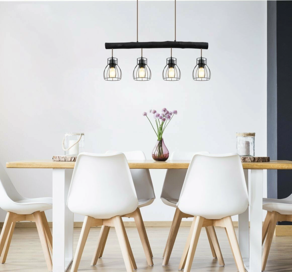 Diese 4-flammige Pendelleuchte im Industrial-Style ist ein echter Hingucker! Sowohl der Holzbalken als auch die Lampenschirme sind in einem matten Schwarz gehalten. Die champagnerfarbenen Kabel bieten einen schönen Kontrast. Die Leuchte wird ohne die passenden E27 Leuchtmittel geliefert. Mit der Wahl von LED-Lampen können Sie zusätzlich Energie sparen.