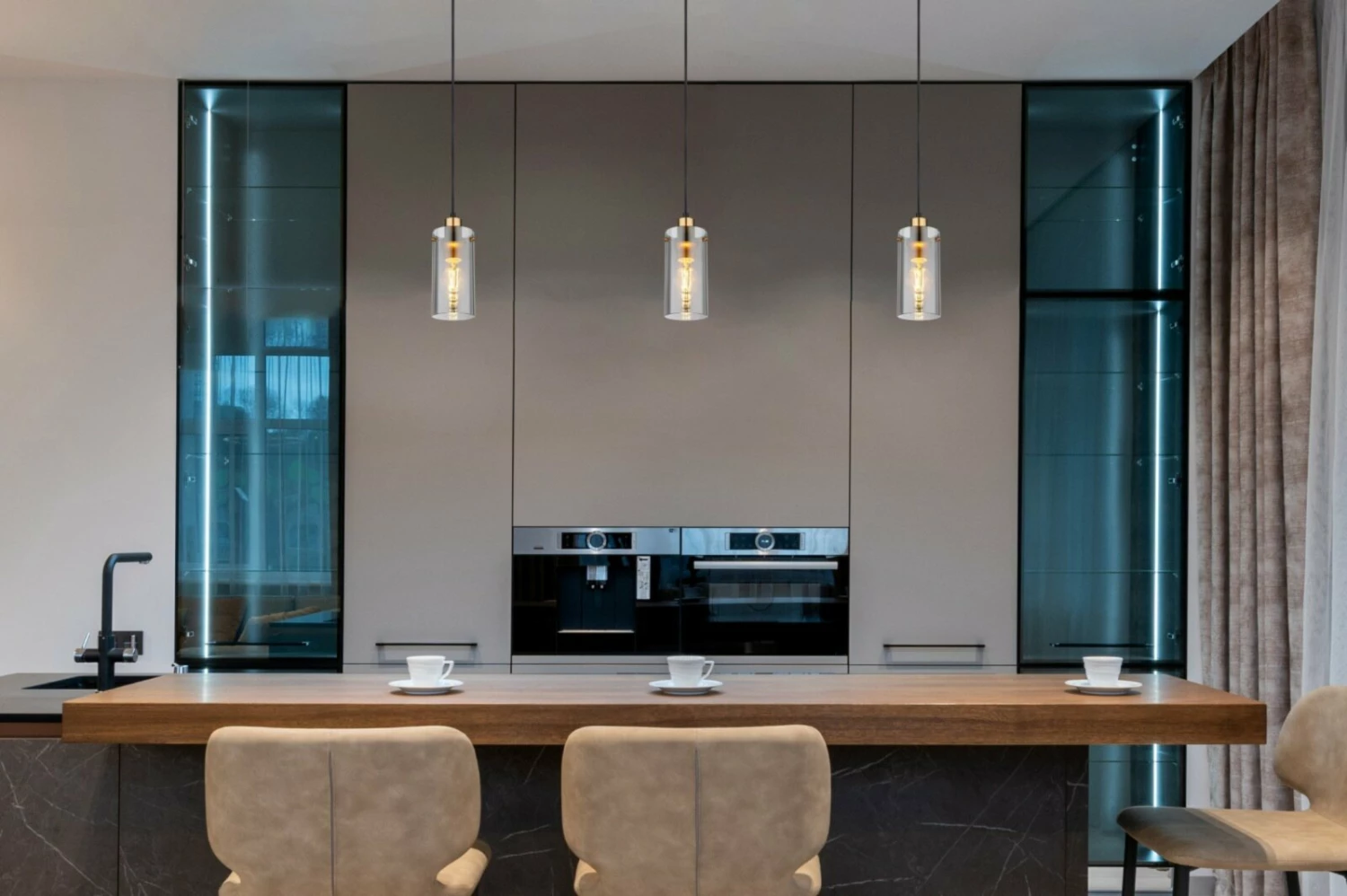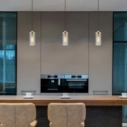Diese Pendelleuchte sieht sehr modern aus, vorallem wegen des rauchfarbigen Glases. In Anbetracht der Farbkombination liefert die Pendelleuchte ein markantes Aussehen. Sie ist etwa 10 cm breit, 120 cm hoch und 10 cm tief.