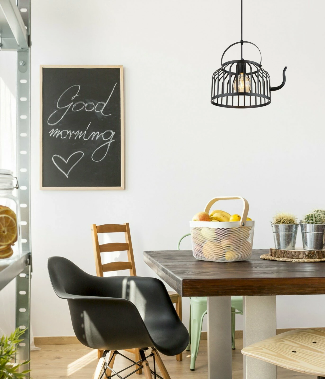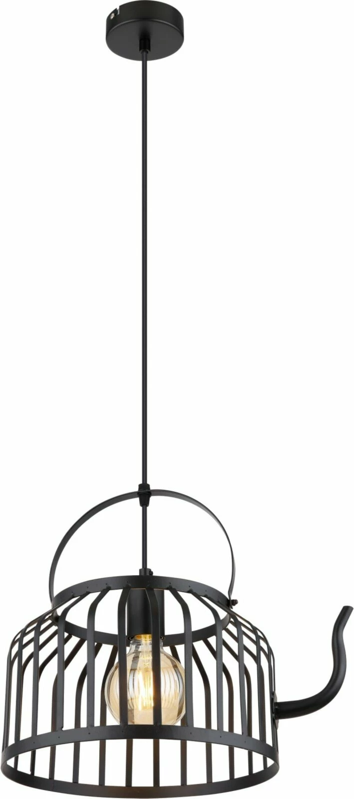 Die Pendelleuchte verfügt über einen Gitterschirm, der in einer Teekannen-Form designt wurde, welcher vom Industrial-Stil geprägt ist. Die Lampe ist etwa 34 cm breit, 120 cm hoch und 30 cm tief.