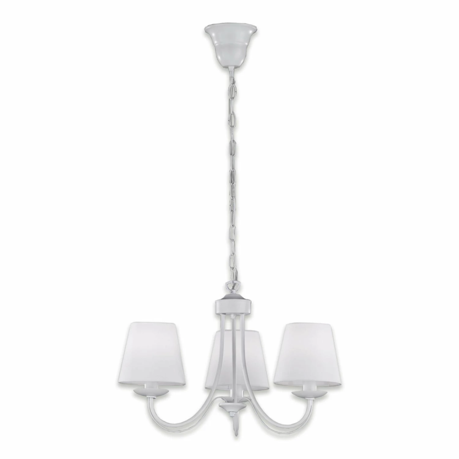 Geschmackvolle Pendelleuchte mit besonderer Formgebung. Die weiße Pendelleuchte ist aus Metall und hat drei Lampenschirme aus Stoff. Geeignet ist die Lampe für drei Fassungen E14 mit maximal 28 Watt und spendet somit ausreichend Licht.