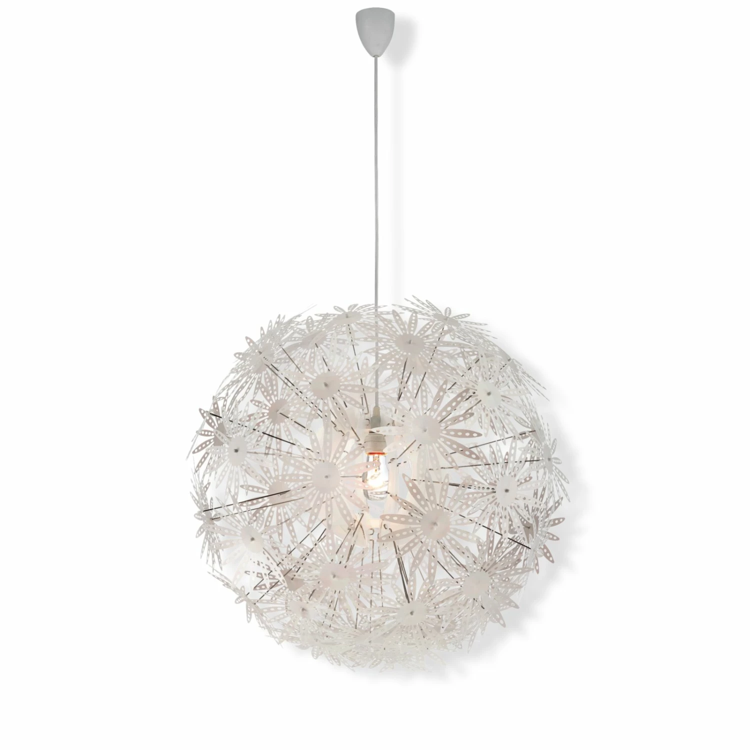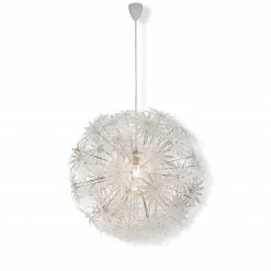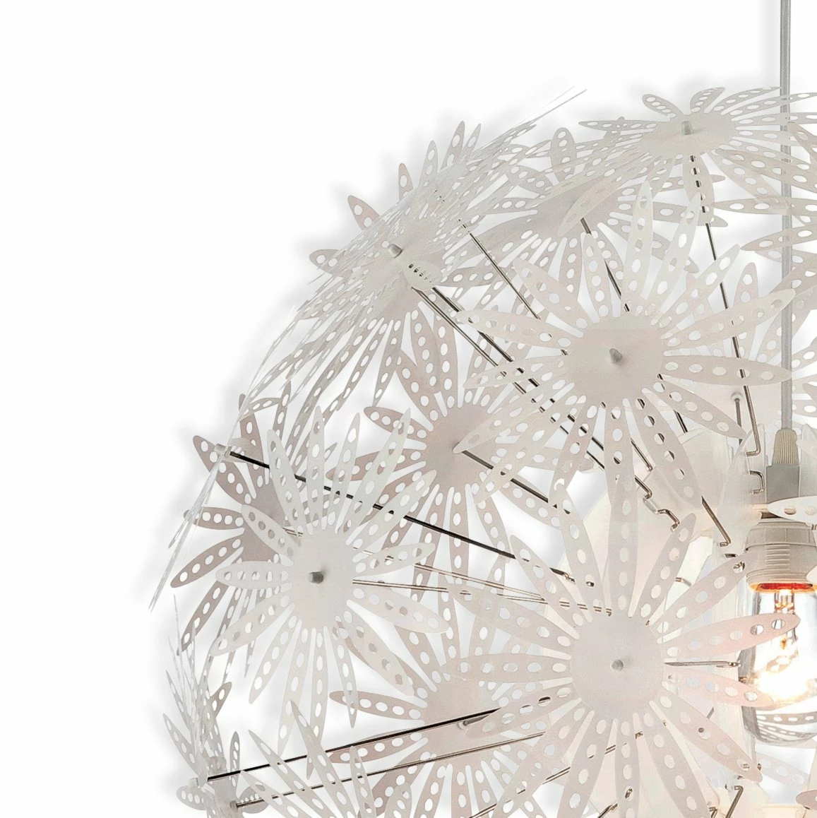 Ausgefallene Pendelleuchte aus weißem Kunststoff mit Blumen-Metallstäben.