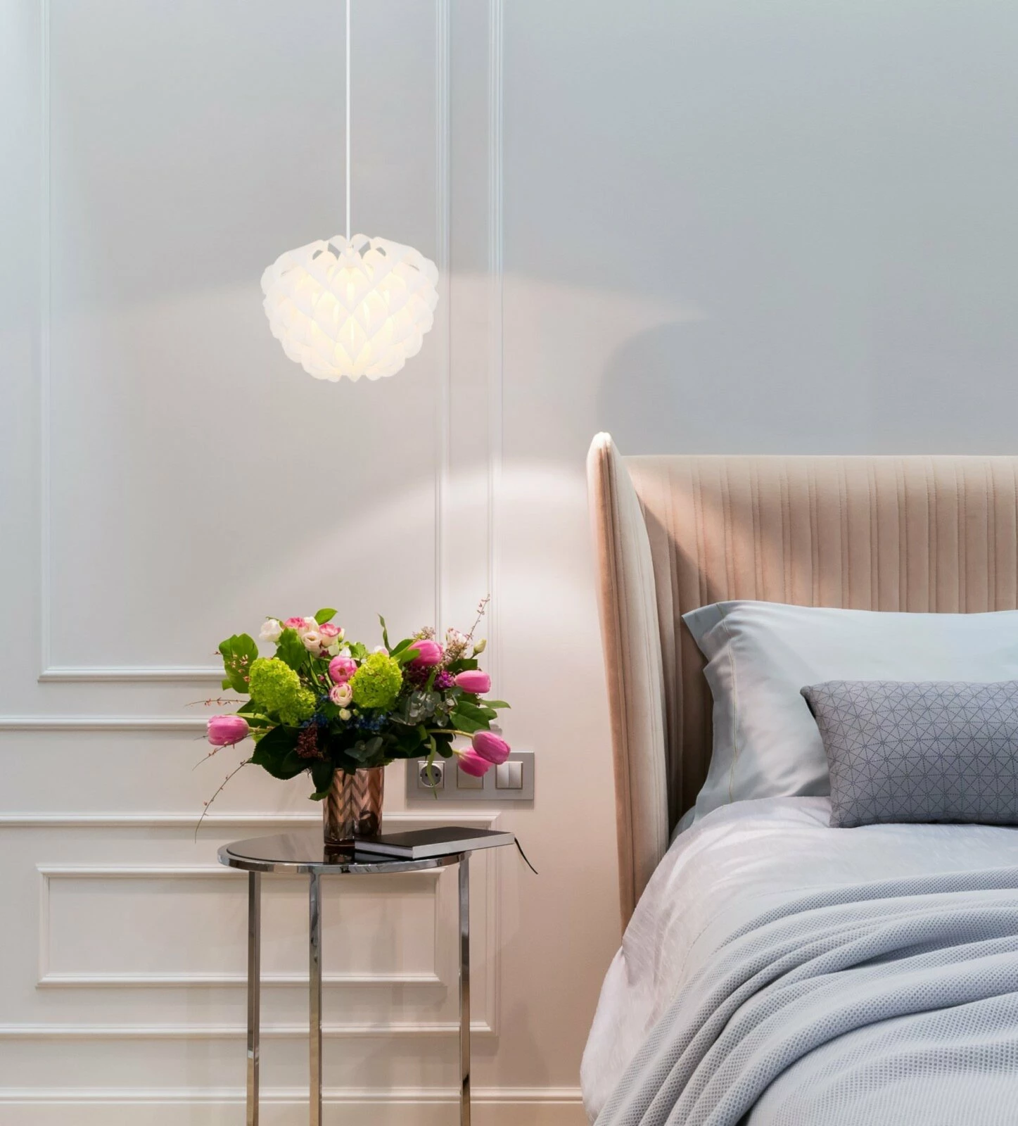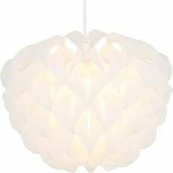Die eintönige Pendelleuchte in Weiß sorgt für eine wohlfühlende Atmopsähre und kann wegen der weißen Farbe in vielen Wohnstilen integriert werden. Sie ist etwa 26 cm breit, 120 cm hoch und 26 cm tief.