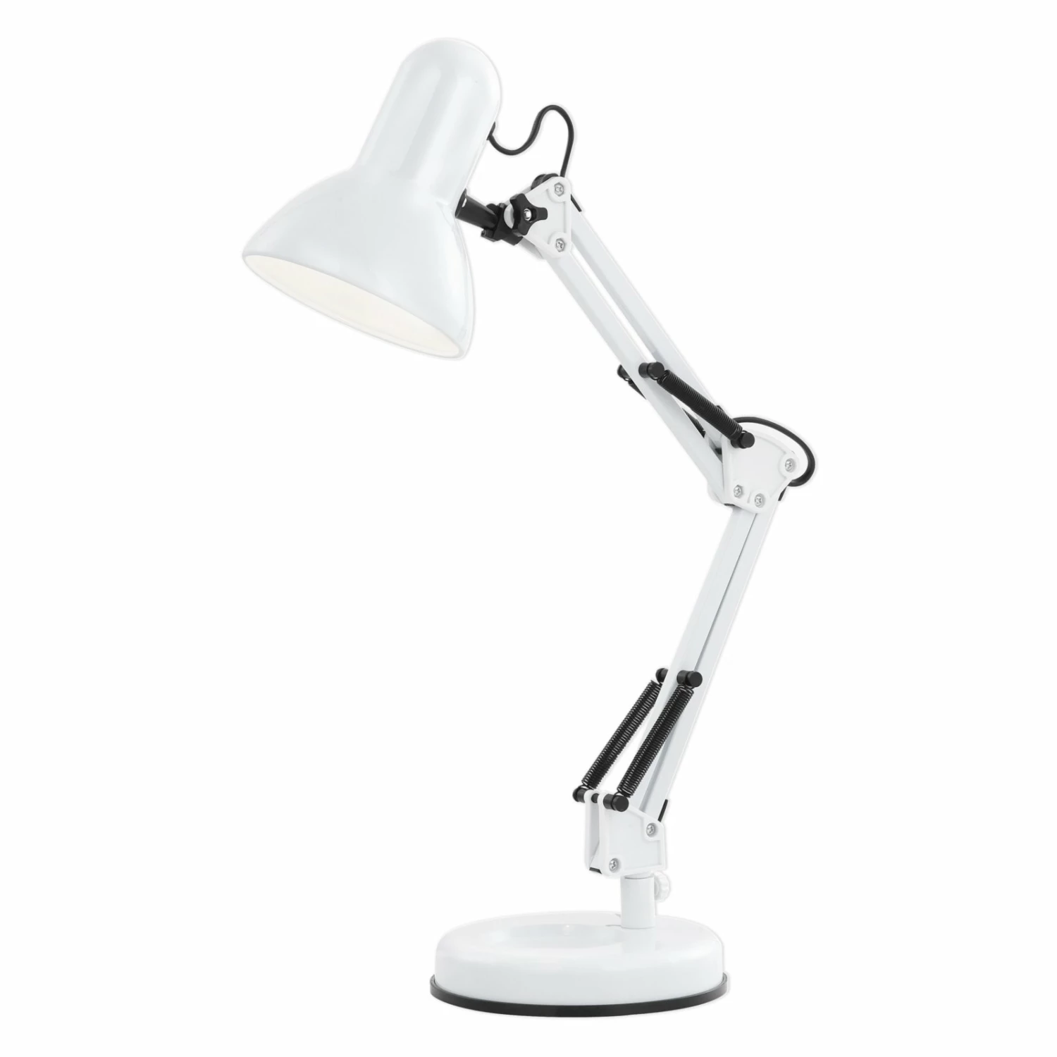 Die Schreibtischleuchte ist in einem edlen Design in Weiß mit schwarzen Highlights gestaltet. Das 3-fach verstellbare Gestell und der große Leuchtenkopf sorgen für optimale Lichtbedingungen beim Arbeiten, Lesen und Lernen. Die Leuchte wird mit einem E27 Leuchtmittel bestückt und verfügt über Zuleitung und Schalter.