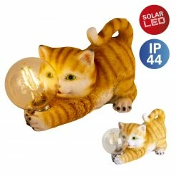 Verspielt, neugierig und voller Lebensfreude erstrahlt die niedliche, kleine Katze im warmweißen LED-Licht und erhellt auch noch ihre Umgebung. In der Leuchte sind zwei Filament-LEDs eingebaut, die äußerlich den alten Glühbirnen ähneln und ein etwas gemütlicheres Licht verströmen. Dank Solarpanel verstrahlt der Stubentiger auch ganz ohne Batterie oder Stromanschluss sein Licht. Das Kätzchen ist bei Tag und Nacht eine fröhliche Garten- oder Terrassendeko.