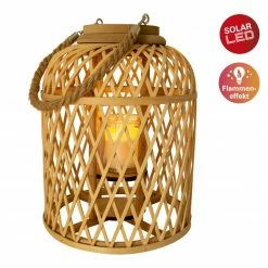 Aus Bambus und Jute setzt sich das wunderbare braune Korbgeflecht zusammen. Daraus hervor hebt sich eine LED-Kerze, die mit einem Flammeneffekt ausgestattet ist, und damit besonders natürlich wirkt. Voll aufgeladen verbreitet die LED ca. 6 bis 8 Stunden ein warmweißes Licht. Die 29 cm hohe Deko-Leuchte können Sie entweder auf dem (Garten-)Tisch in Szene setzen, oder mit der Kordel ganz einfach aufhängen.