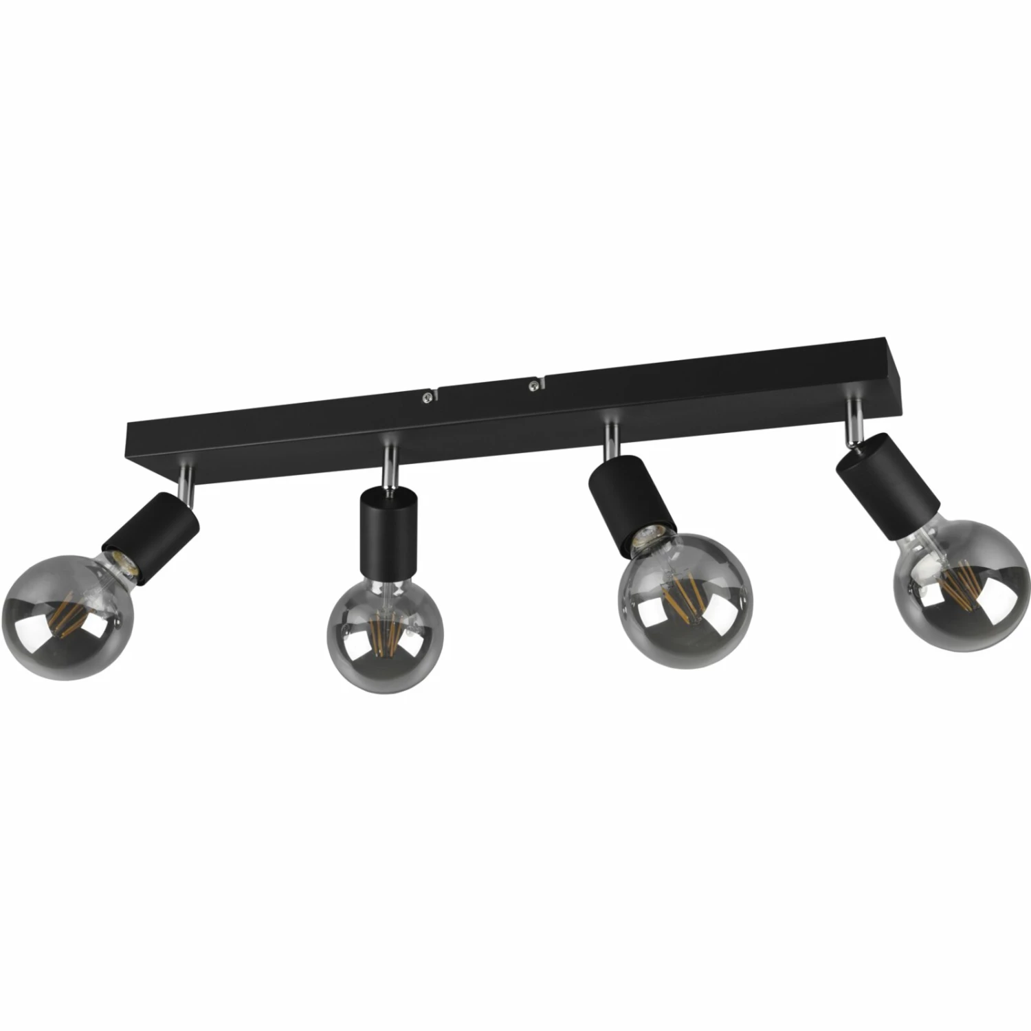 Mit dem 4-flammigen Spotbalken leuchten Sie Ihre Räume individuell aus. Das trendige Deckenpaneel ist mit vier Sockeln ausgestattet, die sich nach Belieben ausrichten lassen. Auf diese Weise können Sie Ihre Bilder oder Möbel perfekt in Szene setzen. Geeignet ist die Deckenleuchte für das Home Office, den Flur oder andere Wohnräume, die gezieltes Licht benötigen. Das 60 cm breite Gehäuse ist aus langlebigem Metall in der Farbe Schwarz gefertigt. Dazu bilden die silberfarbenen Gelenkaufhängungen der Leuchtspots einen dekorativen Kontrast. Die schlichten Fassungen eignen sich für Leuchtmittel in der Größe E27 mit maximal 40 Watt.