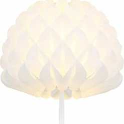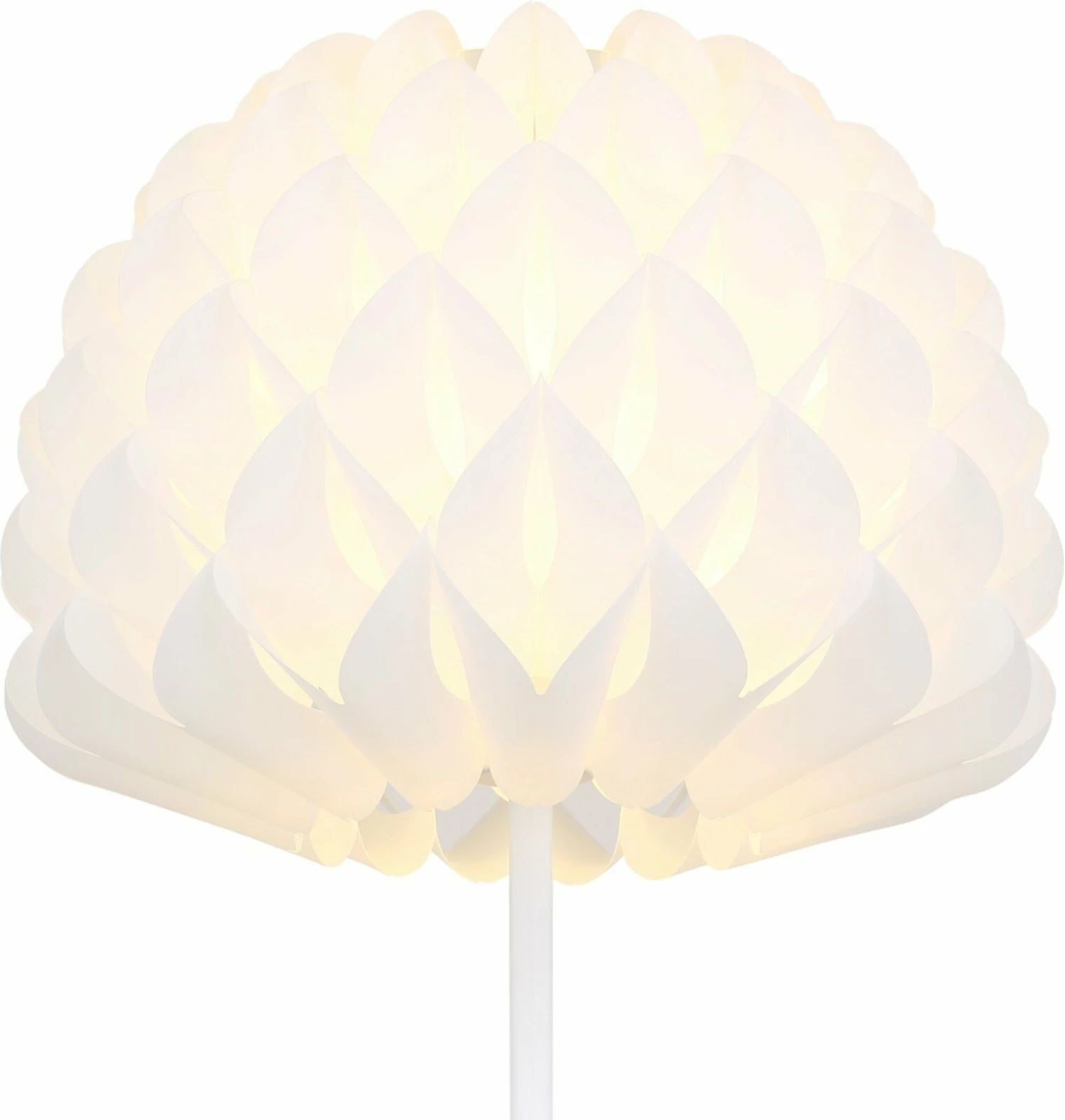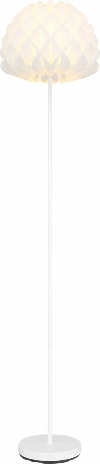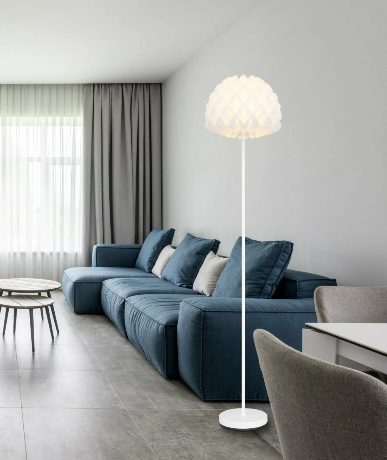 Die eintönige Standleuchte in Weiß sorgt für eine wohlfühlende Atmopsähre und kann wegen der weißen Farbe in vielen Wohnstilen integriert werden. Sie ist mit einem Fußtrittschalter ausgestattet und etwa 26 cm breit, 120 cm hoch und 26 cm tief.