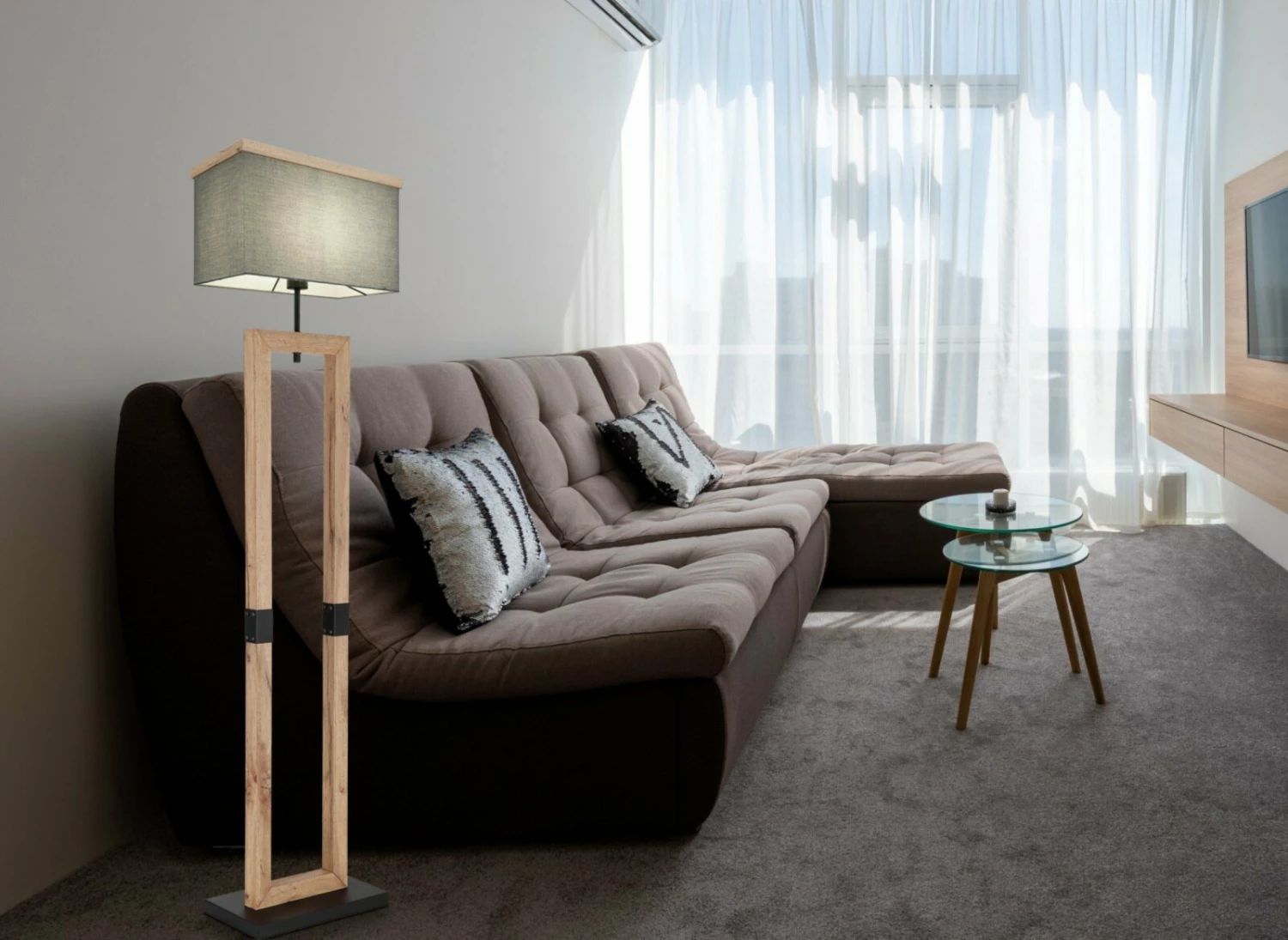 Diese Stehlampe in Anthrazit und Schwarz matt sorgt wegen der Holzoptik und des zeitlosen Schirmdesigns für eine moderne Atmosphäre, die in viele Wohnstile integriert werden kann. Sie ist etwa 40 cm breit, 155 cm hoch und 20 cm tief.