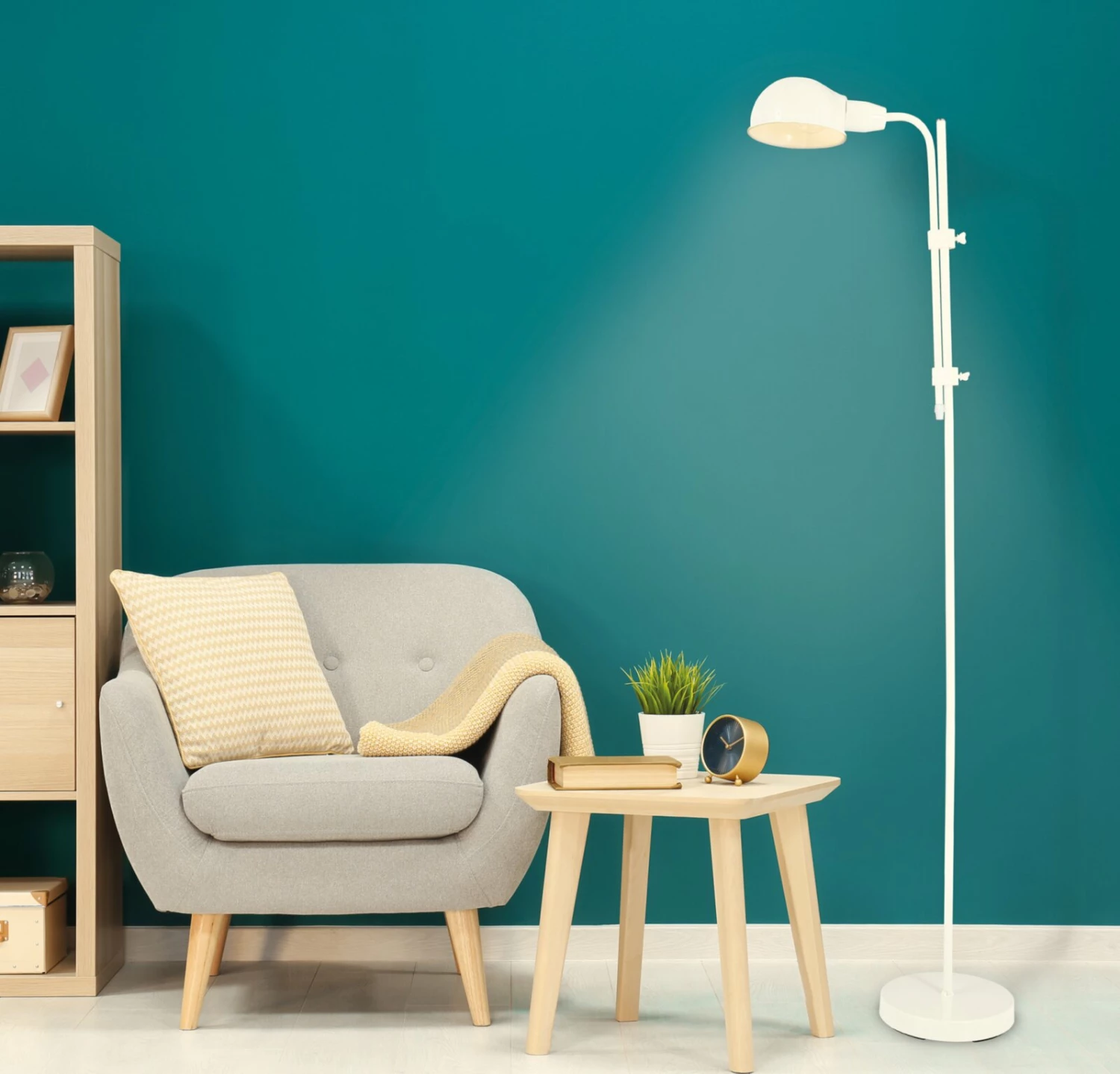 Die Stehleuchte ALANI im Retro-Design und in schlichtem Weiß ist ein echter Hingucker. Sie eignet sich perfekt als Lichtquelle für entspannte Leseabende auf der Couch. Erhellen Sie ihren Raum mit dieser hübschen Stehleuchte.