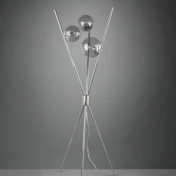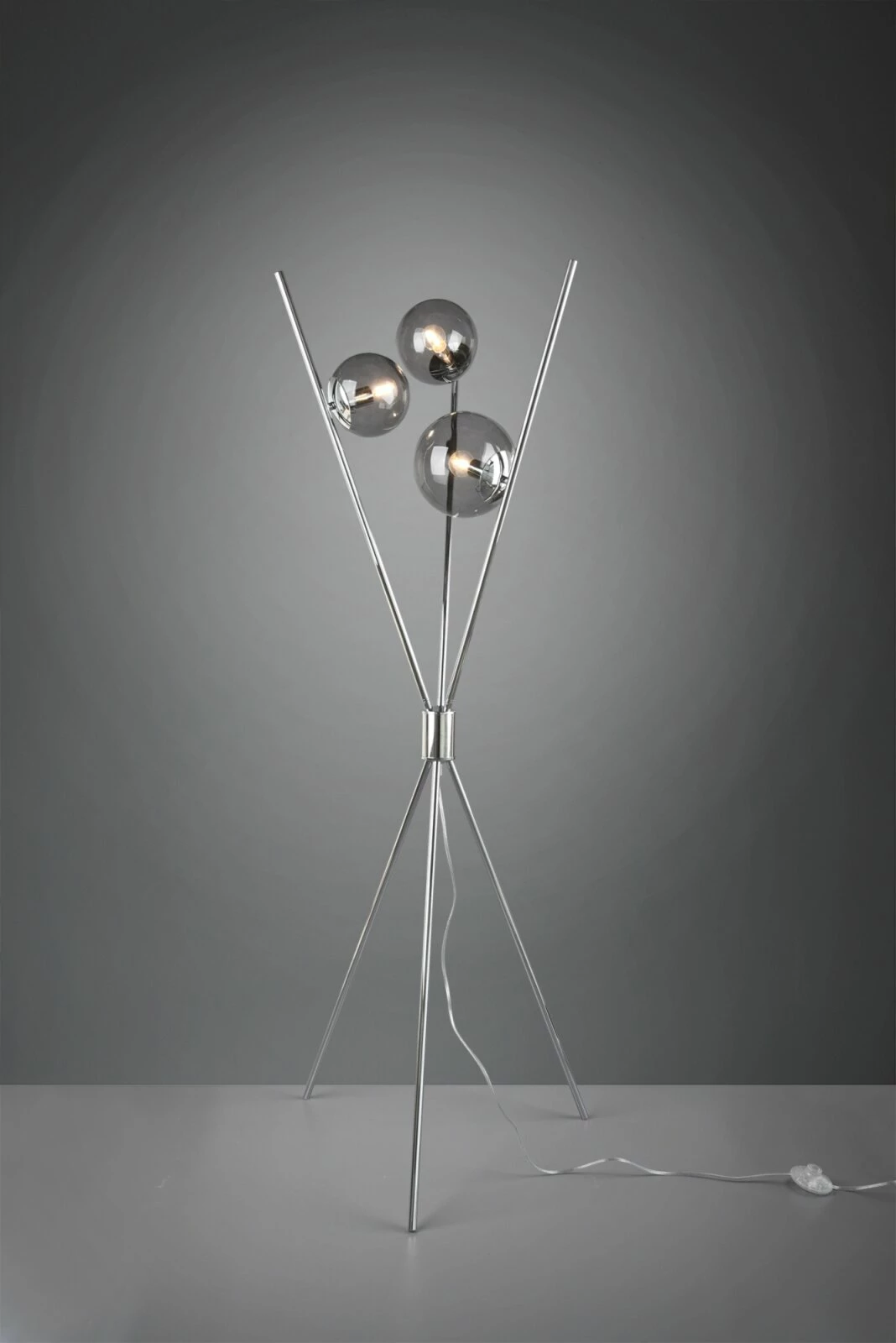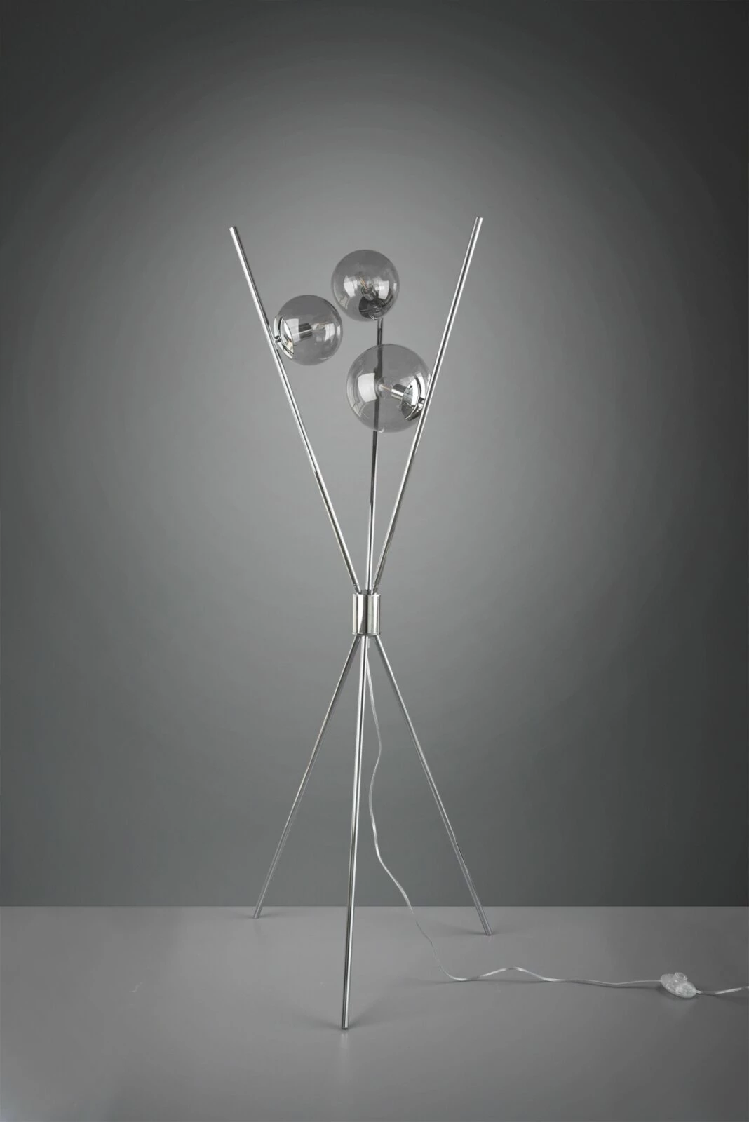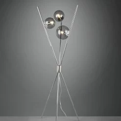 Die 3-flammige Stehleuchte präsentiert sich in einem schlichten aber eleganten Design, welches in jeder Einrichtung ihren Platz finden kann. Die Stehleuchte verfügt über einen Fußschalter, der Ihnen die Nutzung der Stehleuchte erleichtert. Rauchfarbige Gläser runden das elegante Design ab, wodurch ein attraktives Gesamtbild entsteht.