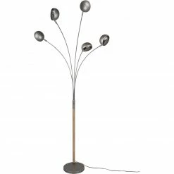 Die 5-flammige Stehleuchte besticht durch ihr Finish in Nickel-Antik und die edlen Holzdetails. Ihr modernes Design lässt sich in viele Wohnstile integrieren. Sie ist mit schwenkbaren Schirmen ausgestattet, sodass Sie die Lichtkegel individuell ausrichten können. Dadurch stellt die Innenleuchte nicht nur ein Ambientelicht in Ihrem Wohnraum her, sondern eignet sich perfekt zum Lesen oder für Handarbeiten. Die filigran wirkenden Arme können Sie nach Ihrem Geschmack anordnen. Wie die kuppelförmigen Lampenschirme sind sie aus pflegeleichtem Metall gefertigt. Sie münden in einem schlanken Gestell aus naturfarbenem Holz. Direkt darüber ist der leicht bedienbare Kippschalter untergebracht. Ein runder Tellerfuß in Marmor-Optik sorgt für einen stabilen Stand. Zum Betrieb der Standleuchte benötigen Sie fünf Leuchtmittel mit E14-Sockel mit maximal 10 Watt.