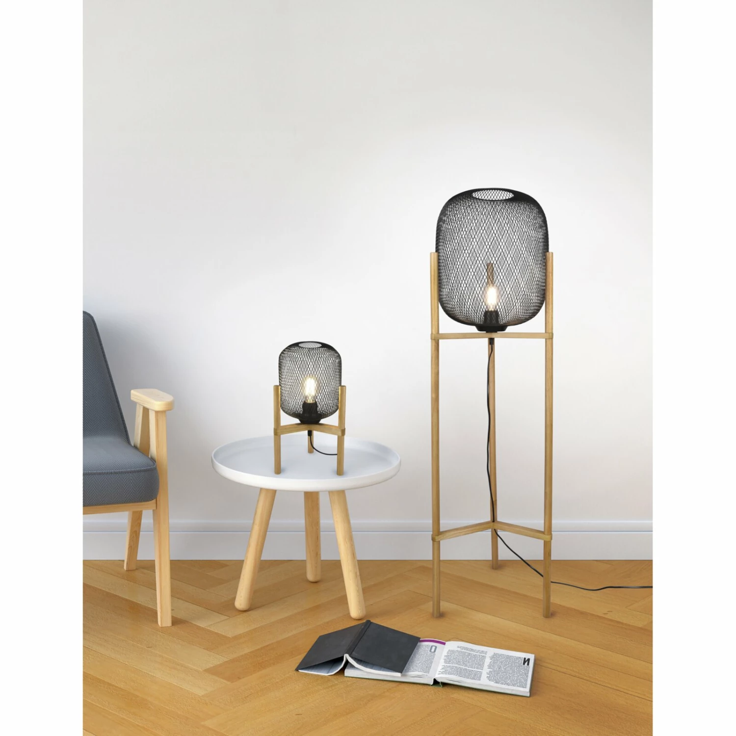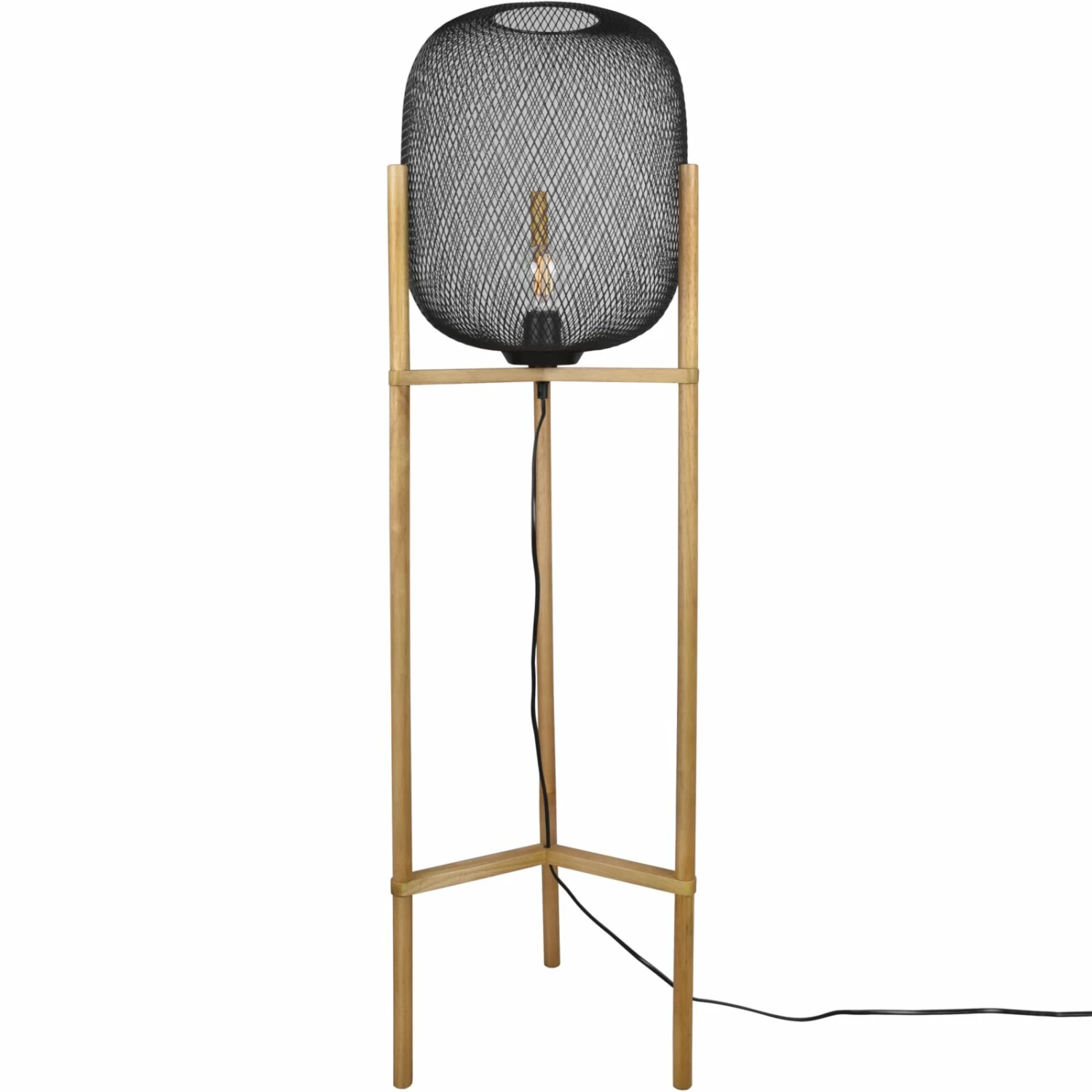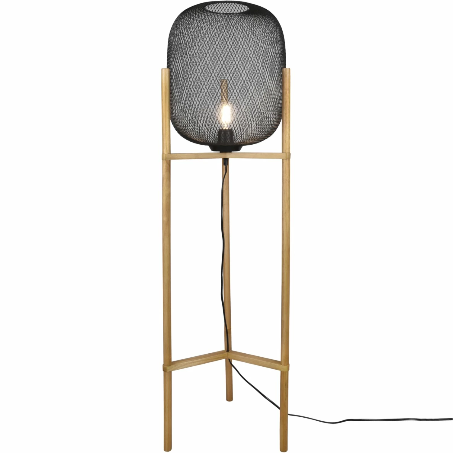 Mit dieser Stehleuchte im Materialmix schaffen Sie einen Hingucker in Ihrem Zuhause. Gleichzeitig sorgt sie für ein angenehmes Ambientelicht oder eignet sich für gemütliche Lesestunden. Die Innenleuchte ist im modernen Industriestil gehalten und besitzt einen Lampenschirm aus Metalldraht in Schwarz. Einen effektvollen Kontrast dazu stellt der 3-teilige Holzfuß her, der durch seine offene Gestaltung viel Bodenfreiheit bietet. Insgesamt überzeugt die Standleuchte durch ihre Verarbeitung und die pflegeleichten Oberflächen. Dank des Schalters in der langen Zuleitung können Sie die Leuchte einfach ein- und ausschalten. Ausgestattet ist sie mit einem E27-Sockel, der für ein Leuchtmittel mit maximal 40 Watt ausgelegt ist.