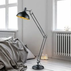 Die Stehleuchte ist durch ihr schwarz gehaltenes Gestell ein dezenter Lichtgeber. Durch zwei Gelenke kann sie nach Wunsch ausgerichtet und der gesamte Wohnraum ausgeleuchtet werden.