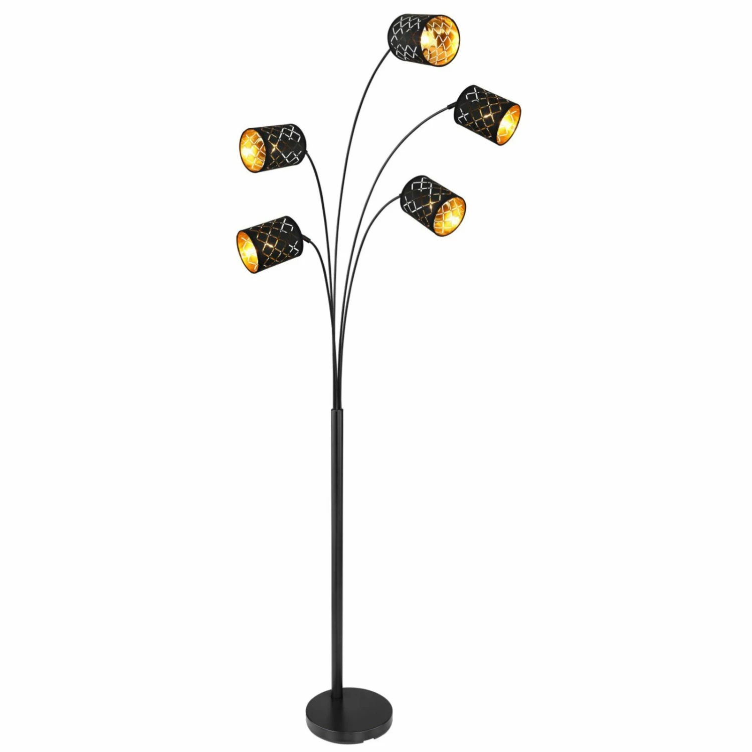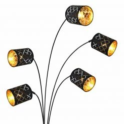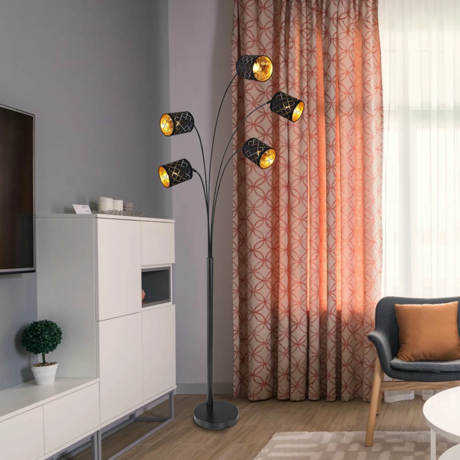 Diese moderne Stehleuchte aus schwarz mattem Metall fügt sich nahezu in jede Wohneinrichtung ein. Die etwa 204 große Leuchte kann mit dem Fußtrittschalter kinderleicht ein- und ausgeschaltet werden. Die 5 Leuchtarme können individuell verstellt werden, sodass dein Raum bestens ausgeleuchtet wird. Die dezenten Dekorstanzungen am textilen Schirm, sowie die golfarbene Innenseite verleihen der Leuchte einen besonderen Akzent.