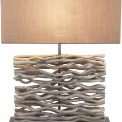 Die Tischlampe in Grau, ist mit einem Wippschalter ausgestattet und sorgt wegen des Stöckerdesigns, für eine beruhigende Atmosphäre. Die Lampe ist 40 cm breit, 50 cm hoch und 15 cm tief.