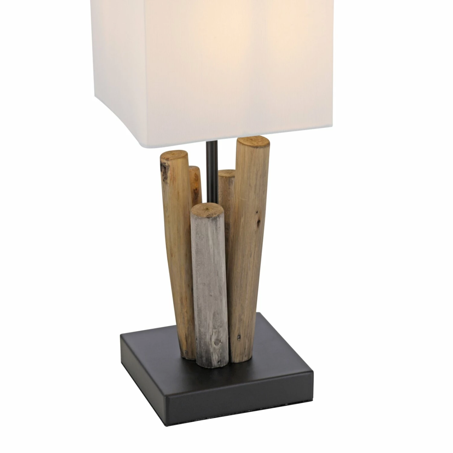 Stylische Tischleuchte mit weißem Baumwollschirm. Der Fuß aus Treibholz verleiht dieser Leuchtquelle eine eindrucksvolle Optik.